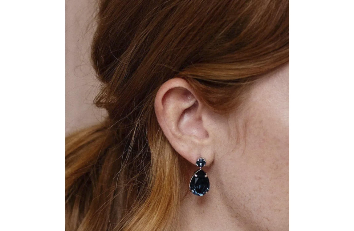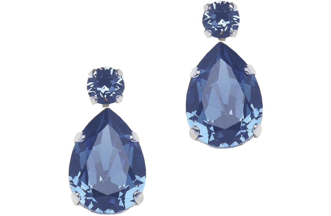 Abrazi Sophia oorbellen O6-OVL-SKT-207. Deze blauwe oorbellen zijn bewerkt met peervormige Swarovski-kristallen in een hoogwaardige setting.