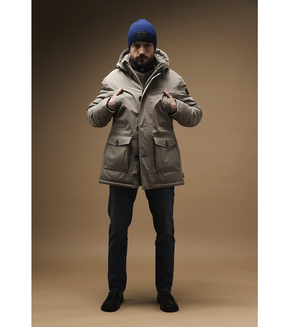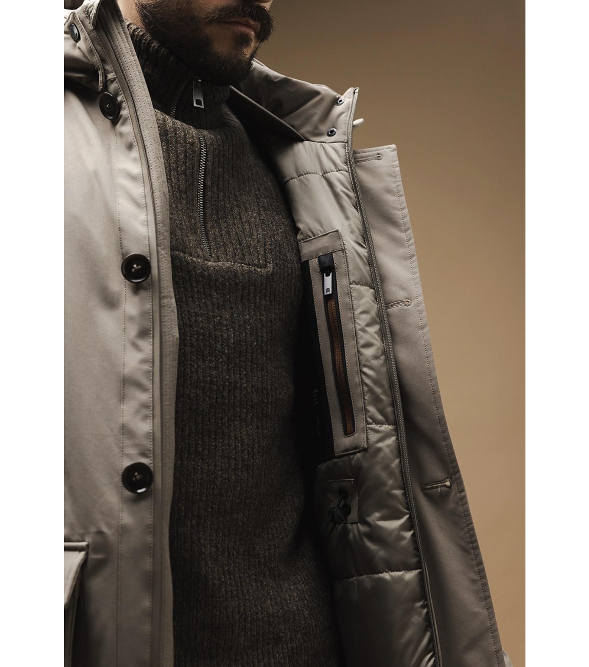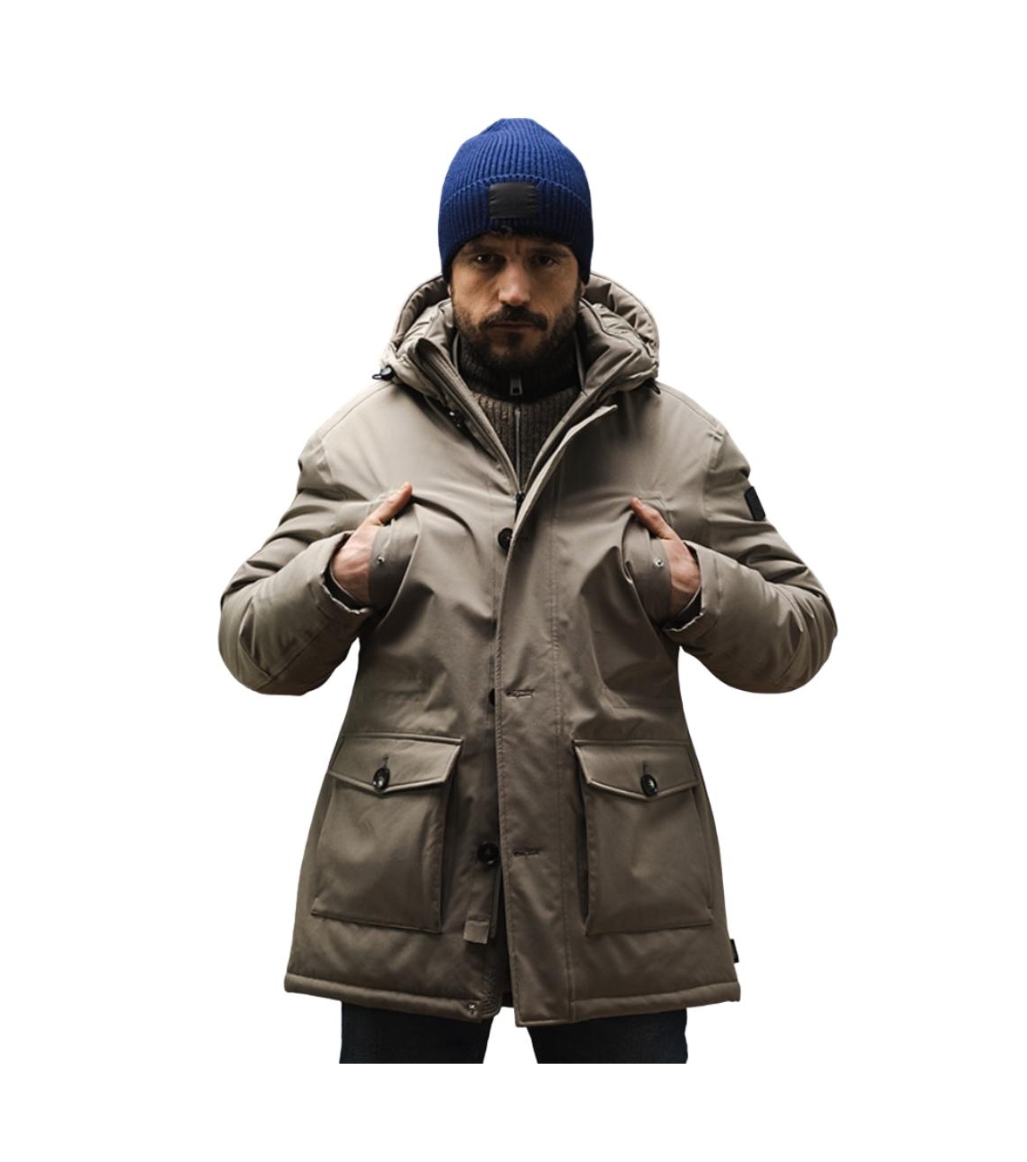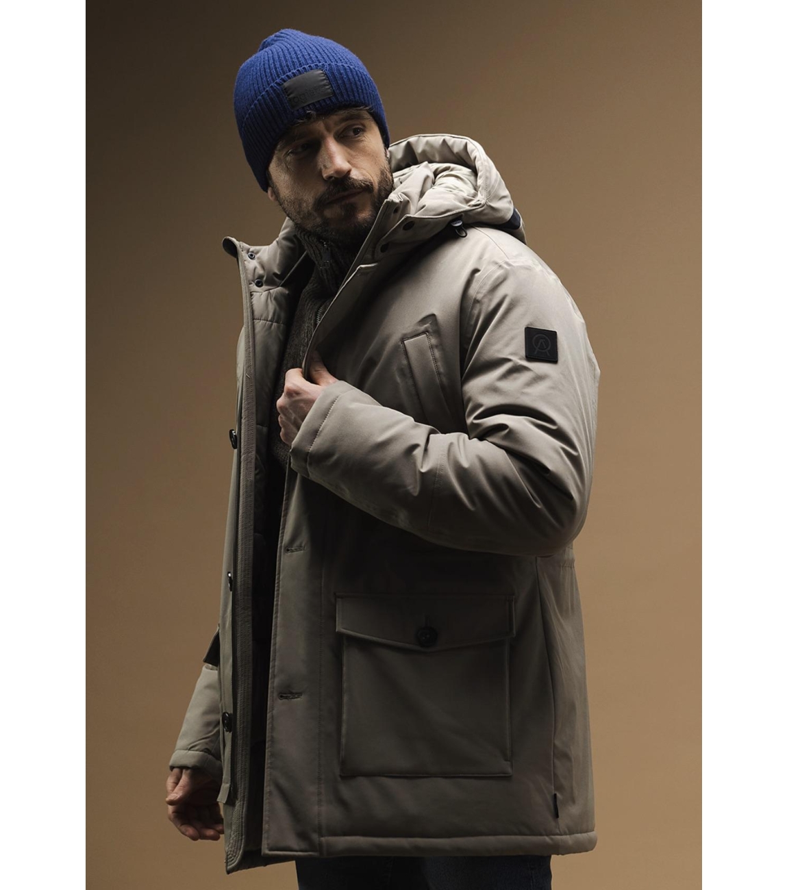 Agiato Santo Sand AT015-51008 winterjas.Het rechtvallend model heeft een capuchon, lange mouwen en sluit door middel van een rits en knopen. Deze bruin kleurige winterjas van Agiato is voorzien van verschillende jaszakken en warm gevoerd.
