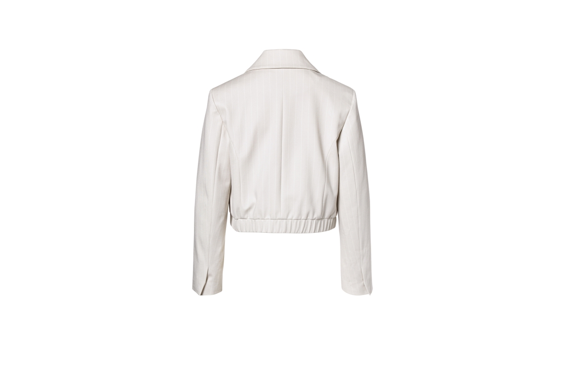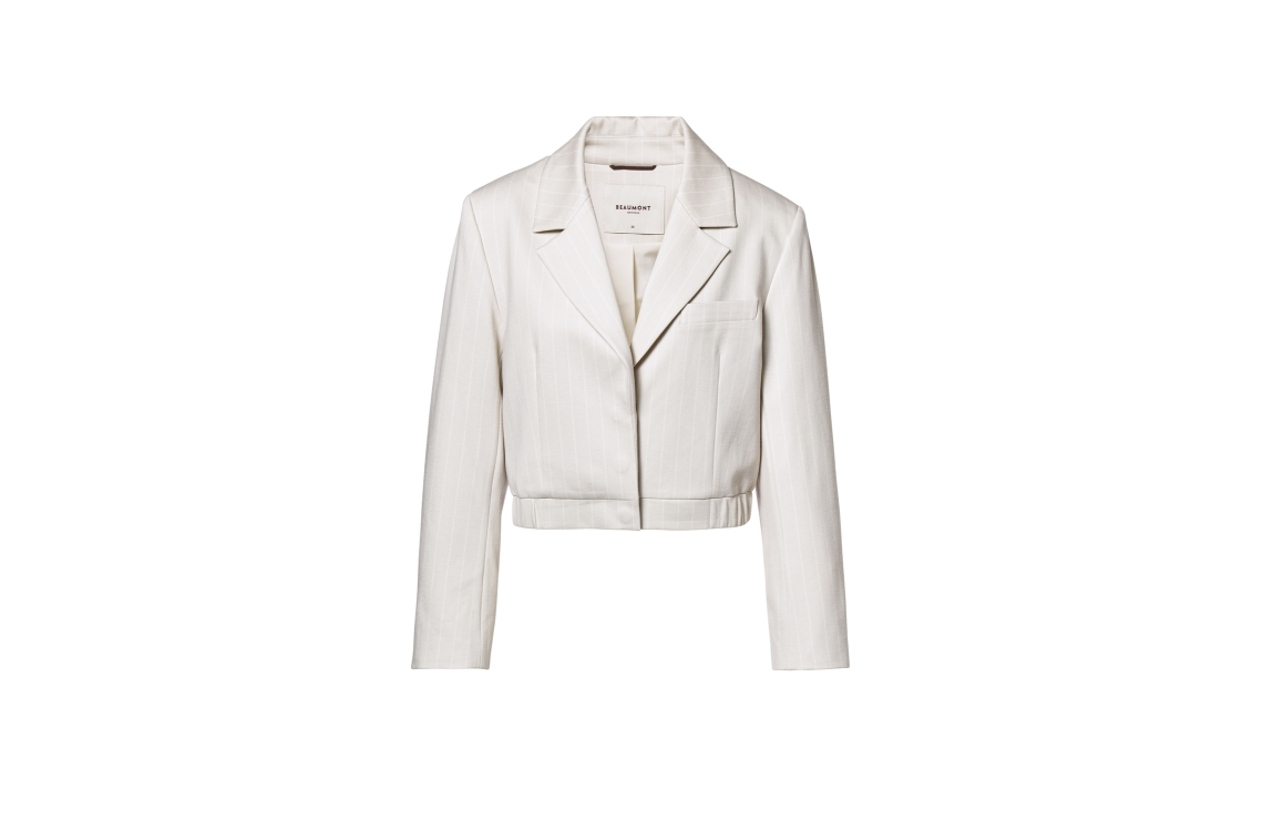Beaumont blazer Dagmar BC55115261 1170. Dit bomber model heeft een reverskraag en lange mouwen. Deze beige/off white blazer van Beaumont sluit aan de voorzijde door middel van blinde drukknopen en is voorzien van een decoratieve borstzak. Het model is all-over bewerkt met een streepprint en heeft een elastische zoom.