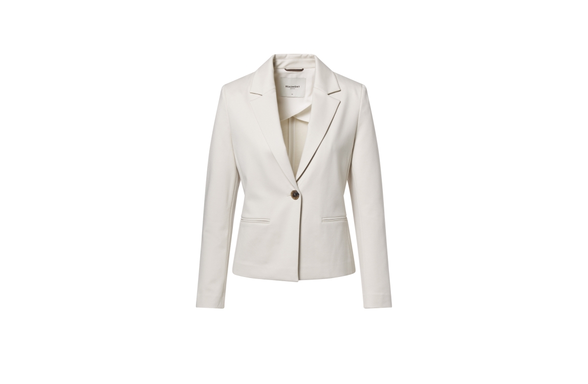 Beaumont PETIT blazer BC55110261. Dit rechtvallend model is voorzien van een reverskraag en heeft lange mouwen. Deze kitkleurige blazer van Beaumont sluit door middel van een knoop en beschikt over twee paspelzakken.