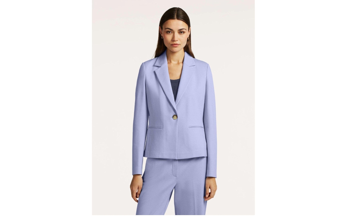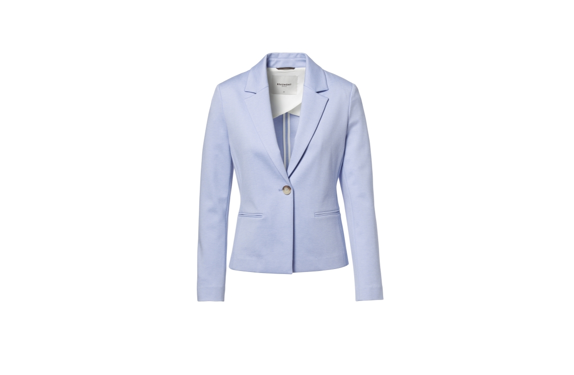 Beaumont blazer Petit 5471. Dit rechtvallende model is voorzien van een kraag en heeft lange mouwen afgewerkt met een split en knopen. Deze lichtblauwe blazer van Beaumont sluit aan de voorzijde door middel van een knoop en is voorzien van twee decoratieve paspelzakken.