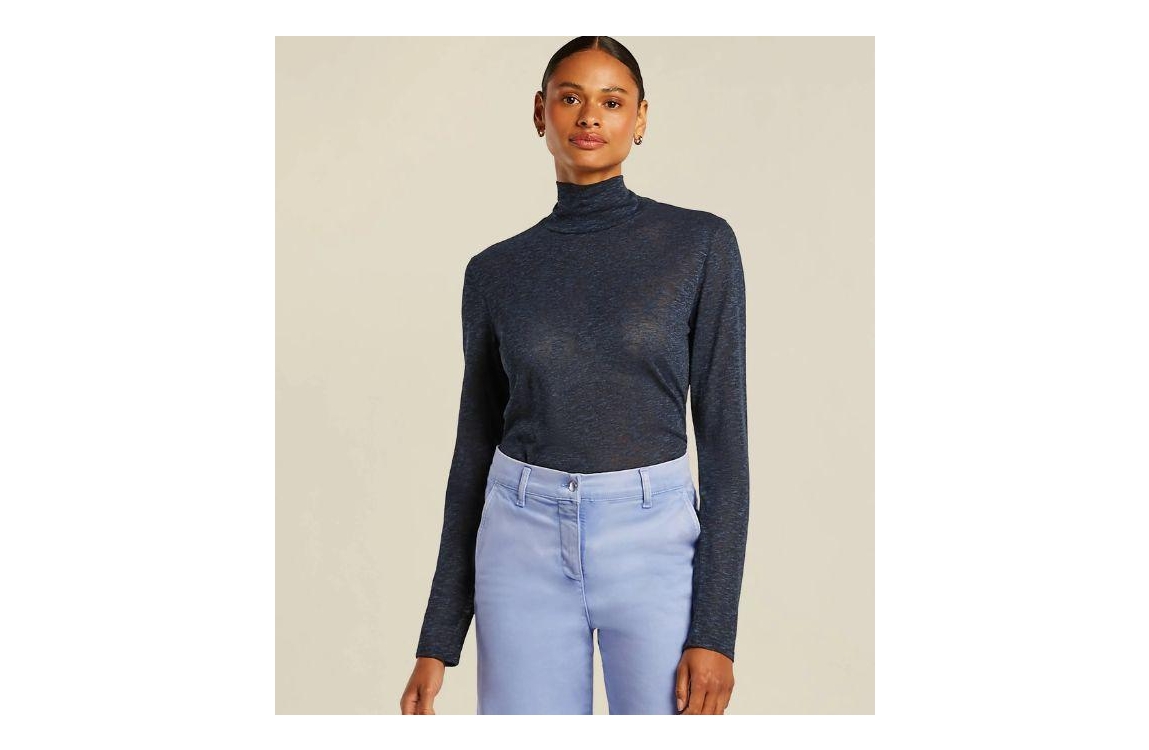 Beaumont SUSY Top 5980 night blue. Dit aangesloten model heeft lange mouwen en een col. Deze donkerblauwe top van Beaumont is bewerkt met een lurex. Dit model is 1,78 m en draagt maat 36.