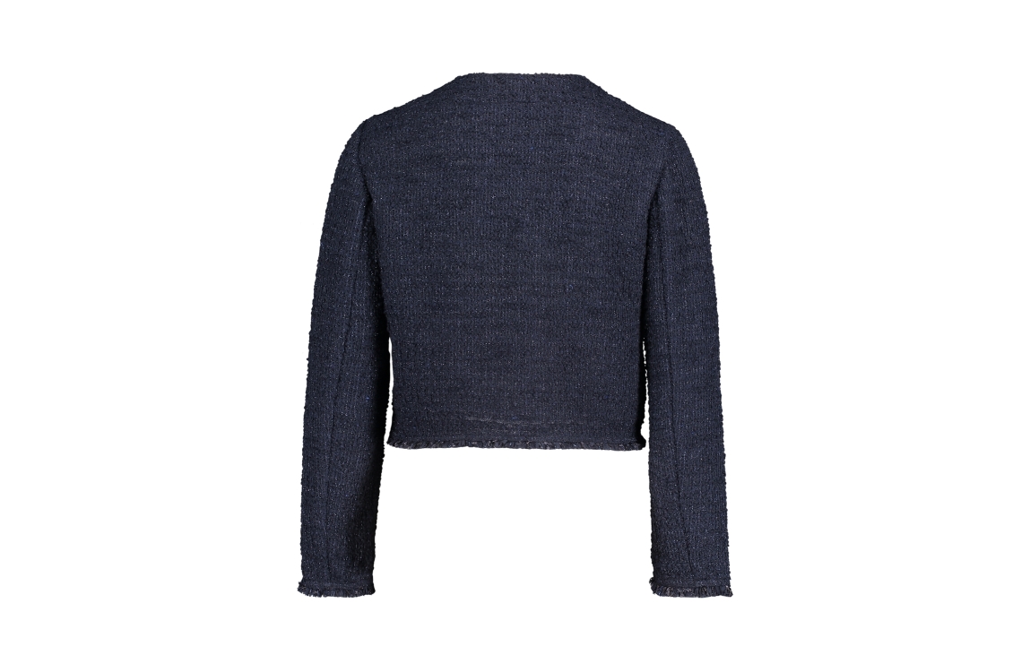 Betty Barclay blazer 47391135 8345. Dit rechtvallende model heeft een ronde halslijn en lange mouwen. Deze donkerblauwe blazer van Betty Barclay sluit aan de voorzijde door middel van goudkleurige knopen en is voorzien van twee sluitbare borstzakken. Het model is all-over bewerkt met glitterdraden en ruffles op de boorden.