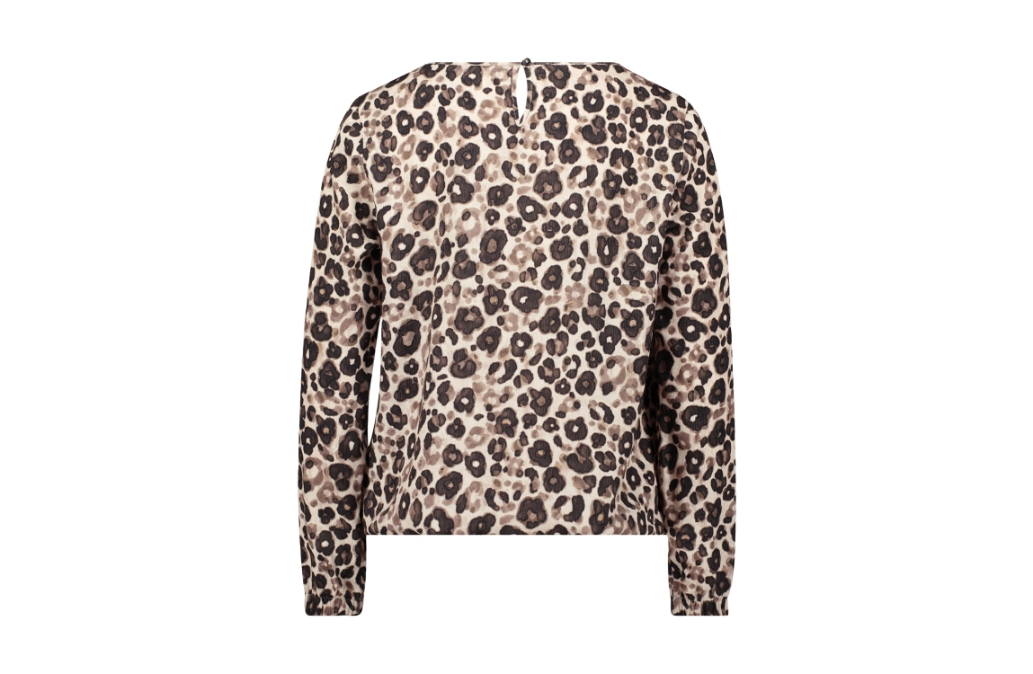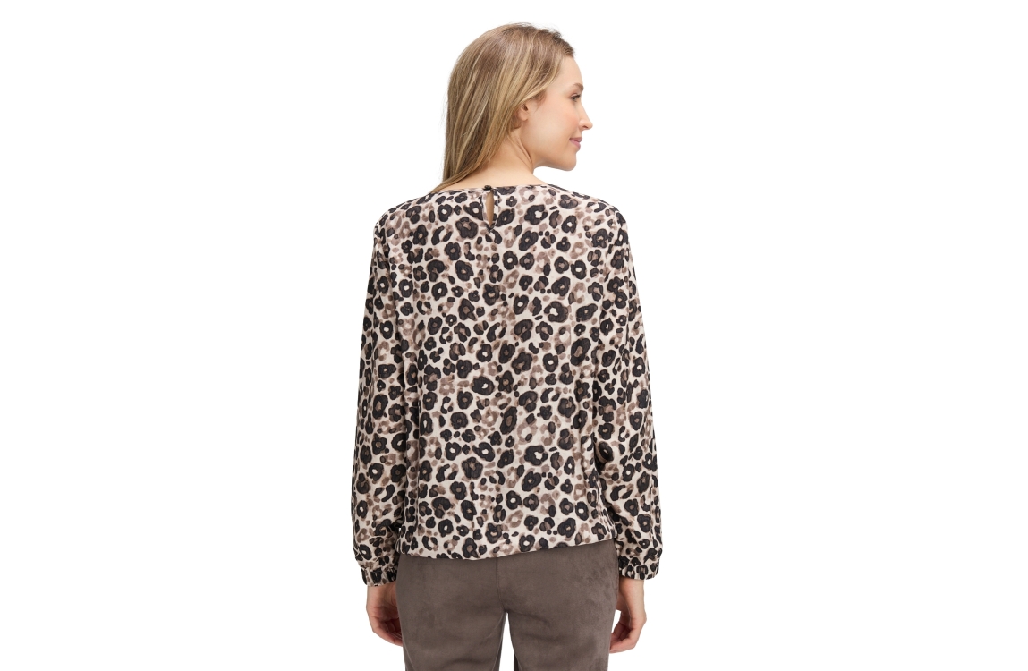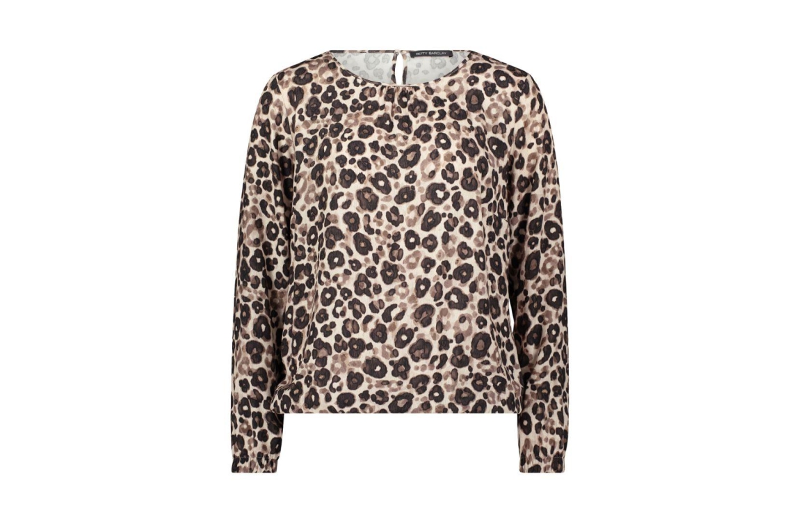 Betty Barclay blouse 89221644 7873. Dit rechtvallende model heeft een ronde halslijn met sluiting en lange mouwen. Deze taupekleurige blouse van Betty Barclay is all-over bewerkt met een panterprint in verschillende tinten en is afgewerkt met een elastische zoom.