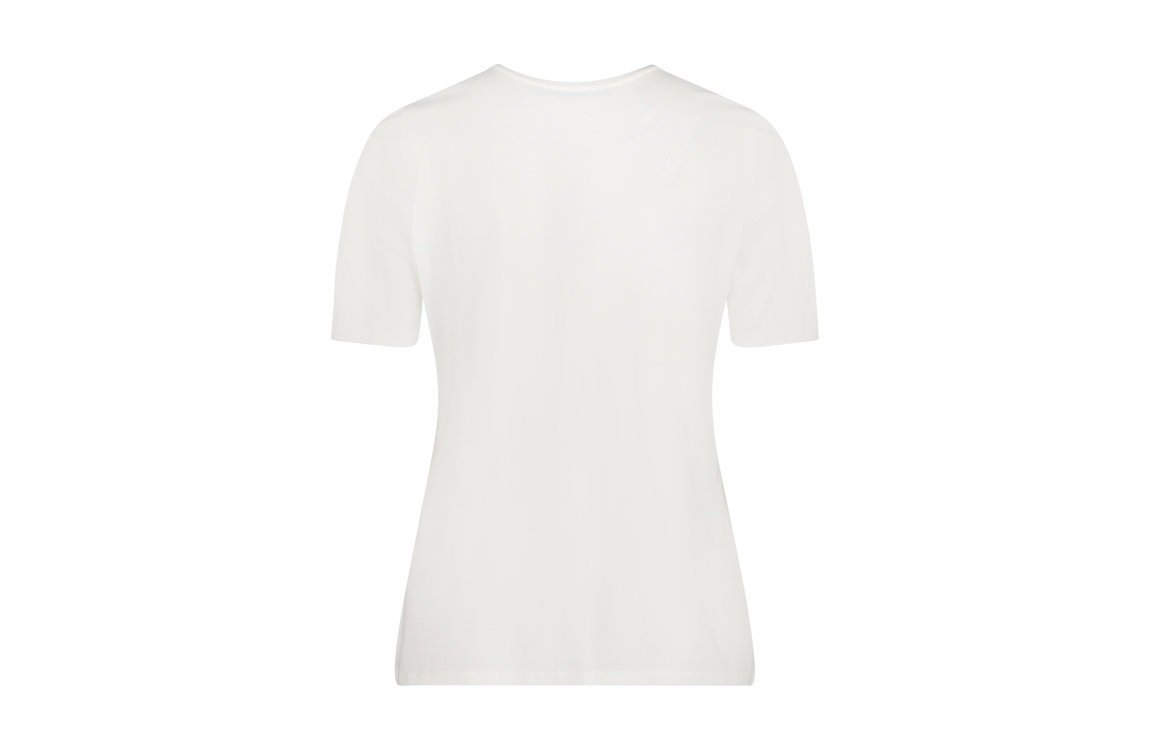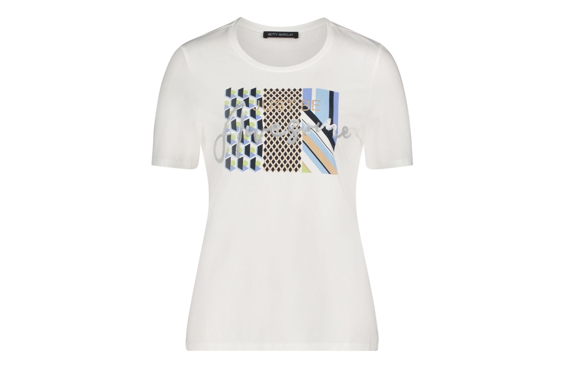 Betty Barclay Shirt Kurz 1/2 Arm 1951 Patch/green. Dit rechtvallende model heeft een ronde hals en korte mouwen. Dit off white T-shirt van Betty Barclay is op het voorpand bewerkt met een grafische opdruk.