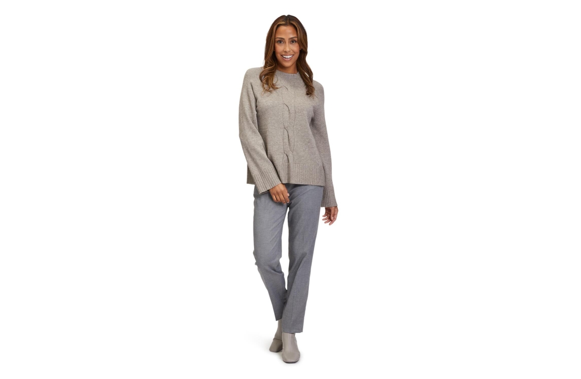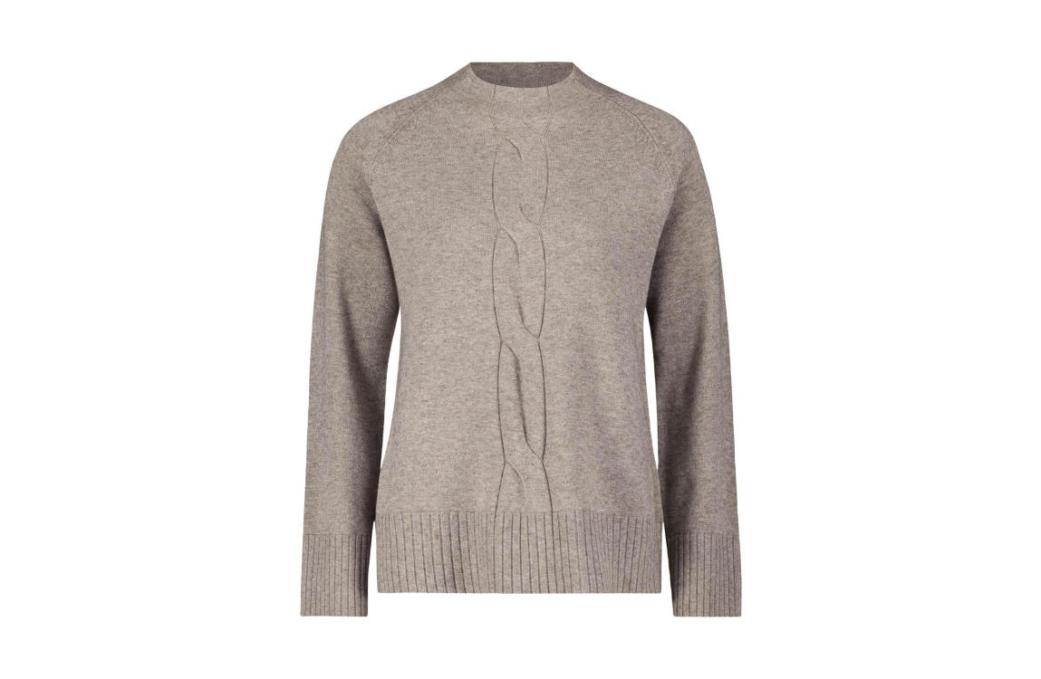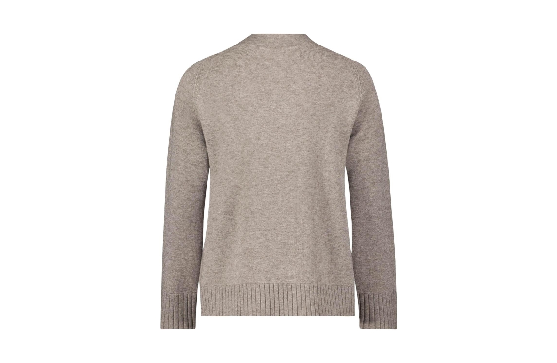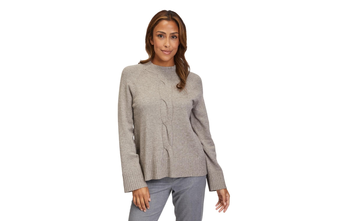 Betty Barclay trui 59881026. Dit soepelvallende model heeft een hoge ronde hals en lange mouwen. Deze taupe kleurige trui van Betty Barclay is voorzien van een kabeldetail op het voorpand.