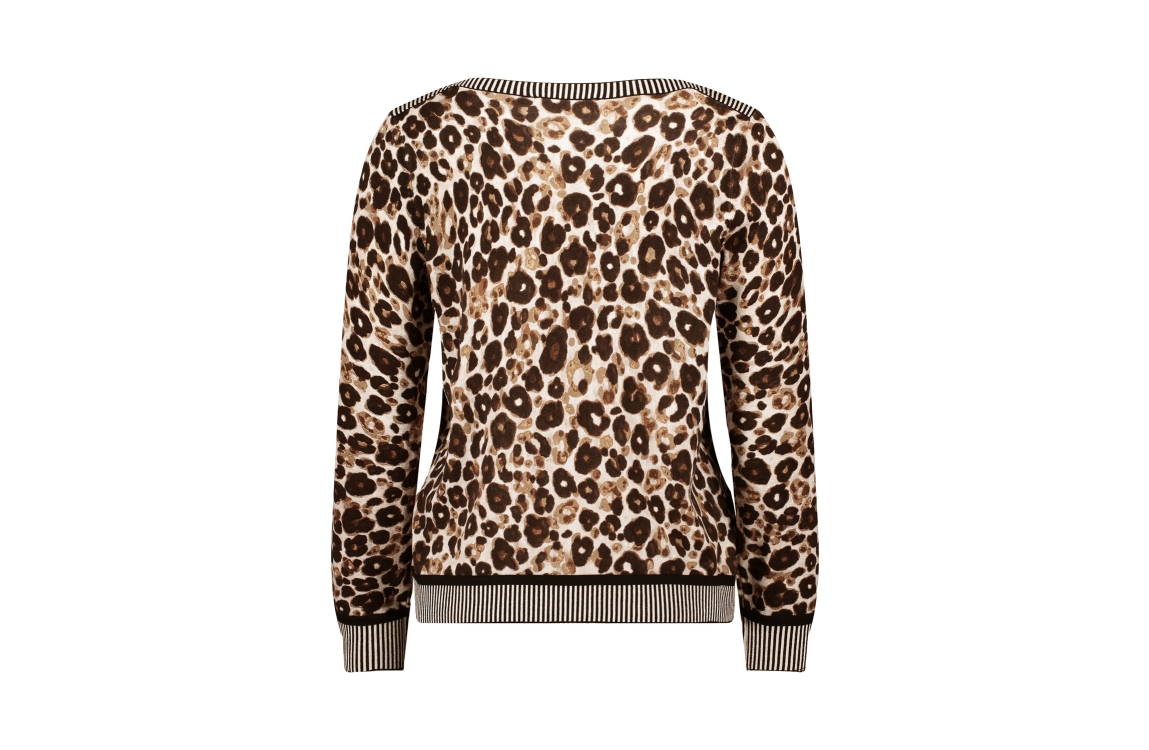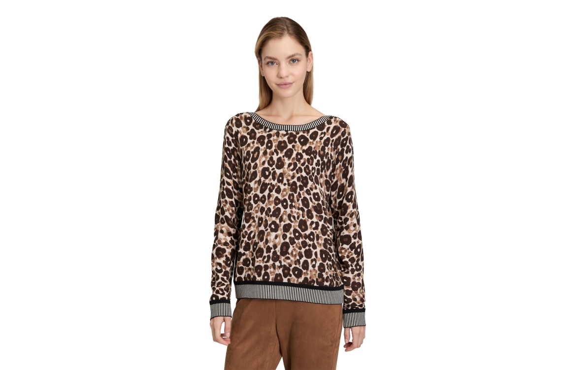 Betty Barclay Strickpullover Kurz 1/1 Arm 7873 Taupe/beige. Dit rechtvallende model heeft een ronde halslijn en lange mouwen. Deze taupekleurige pullover van Betty Barclay is all-over bewerkt met een panterprint in verschillende tinten en heeft ribgebreide boorden.