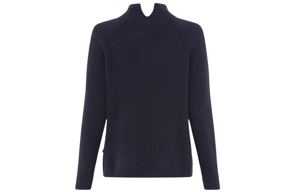 Brax trui Lea 37-2478 90110500. Dit rechtvallende model heeft een hoge hals en lange mouwen. Deze donkerblauwe trui van Brax is op de voorpand gedetailleerd met een kabelpatroon en heeft ribgebreide boorden.