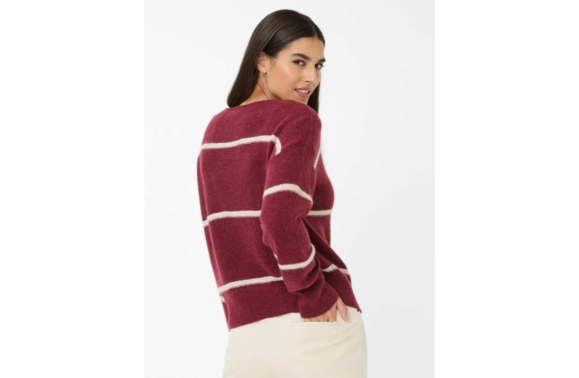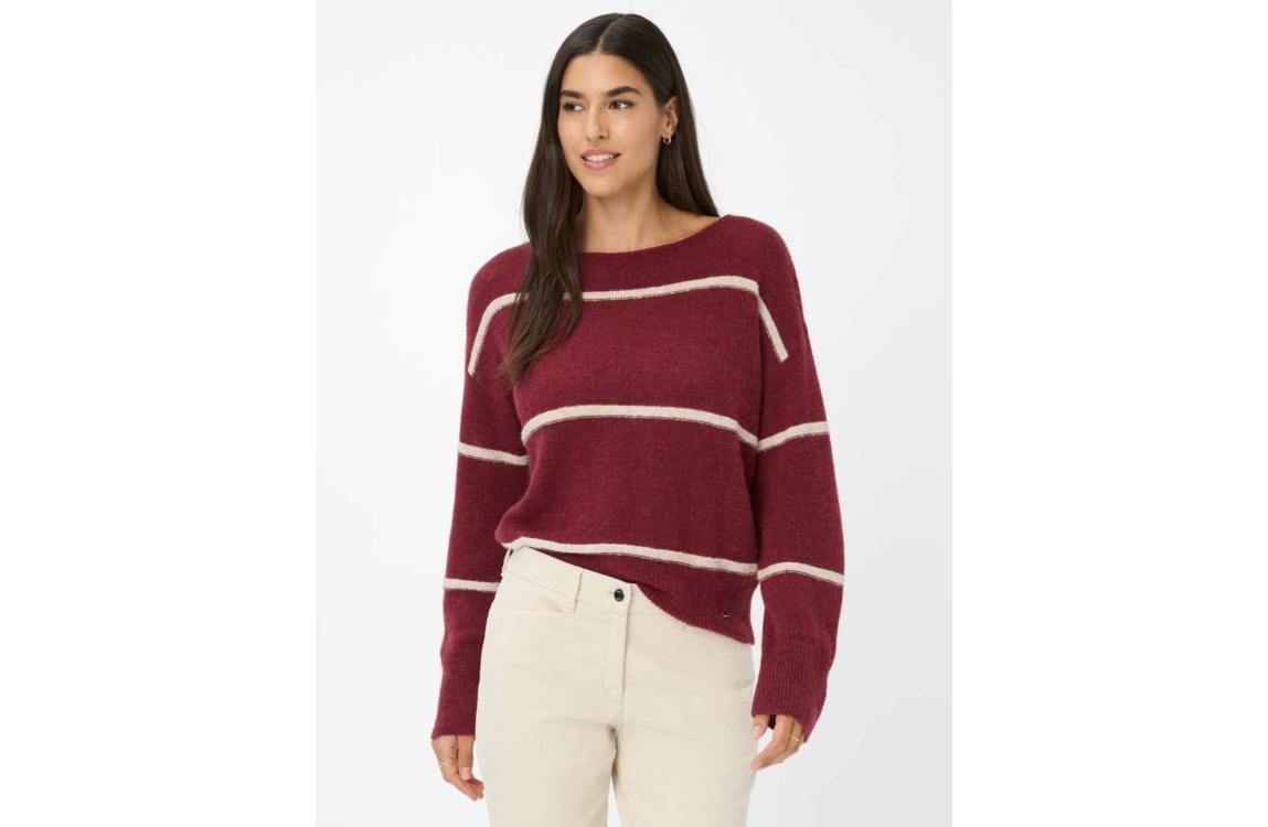Brax STYLE.LISA 40 Mulberry. Dit rechtvallende model heeft een ronde halslijn en lange mouwen. Deze burgundy triu van Brax is all-over bewerkt met een streepprint met glitters