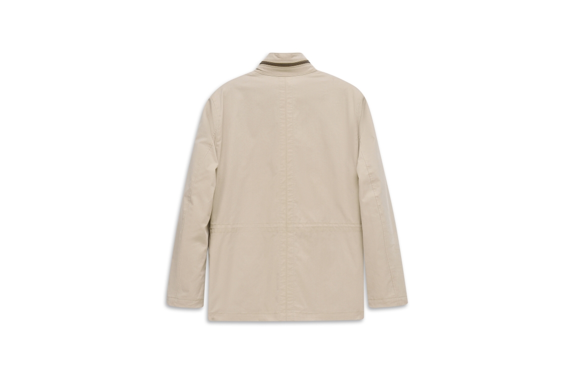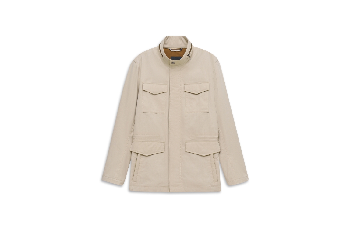Bugatti jas 11041 171200 030. Dit rechtvallende model heeft een opstaande kraag met rits- en knoopdetail en lange mouwen. Deze beige jas van Bugatti sluit aan de voorzijde door middel van een ritssluiting en is voorzien van vier klepzakken.