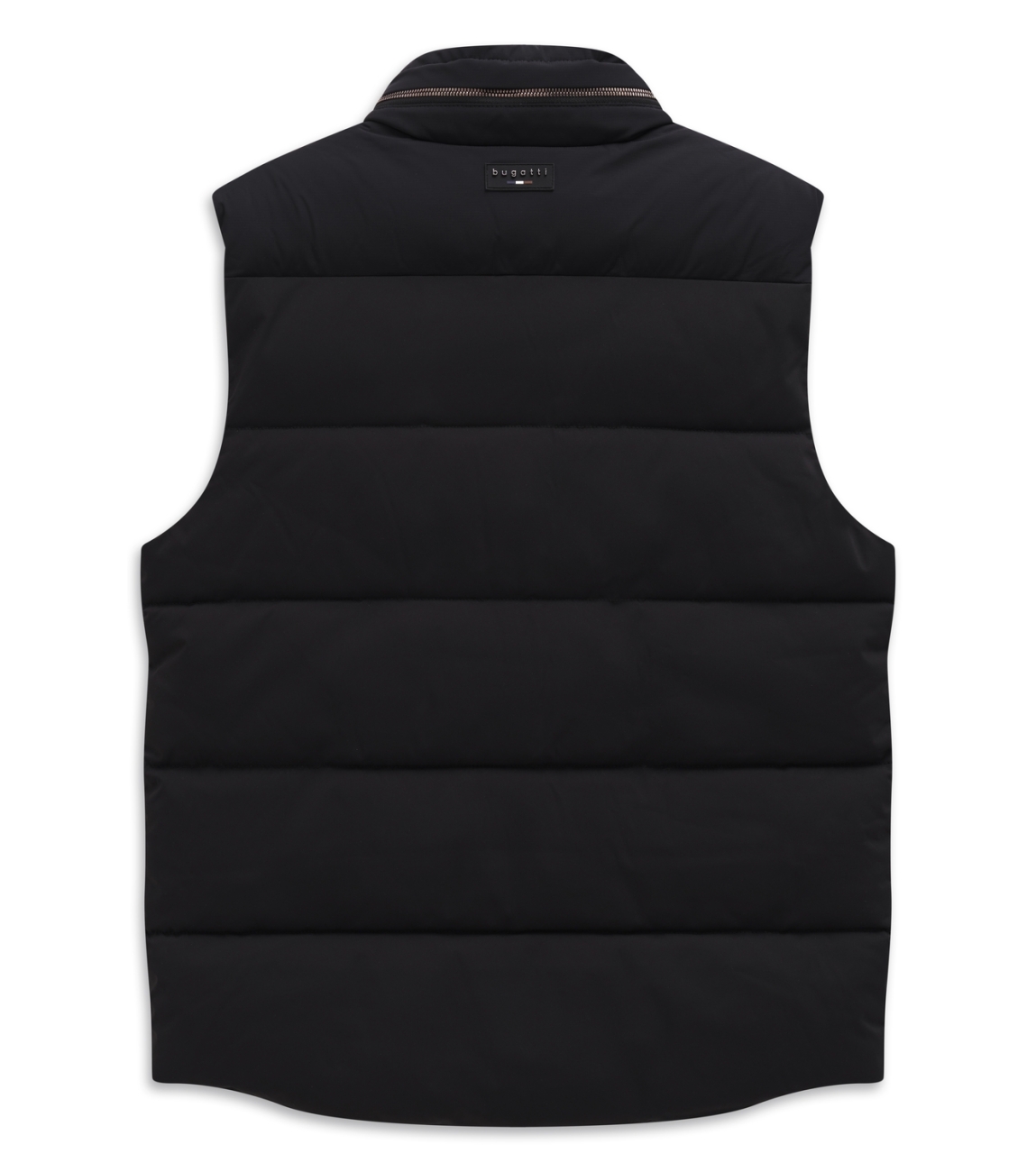 Bugatti HERREN SPORTSWEAR-WESTE 290. Dit rechtvallende model is voorzien van een ronde hals met opstaande kraag en is mouwloos. Deze zwarte bodywarmer van Bugatti sluit door middel van een rits en is afgewerkt met verschillende zakken.
