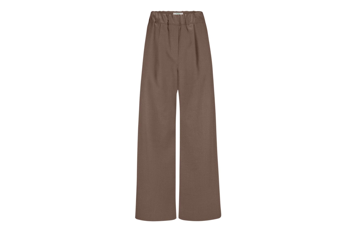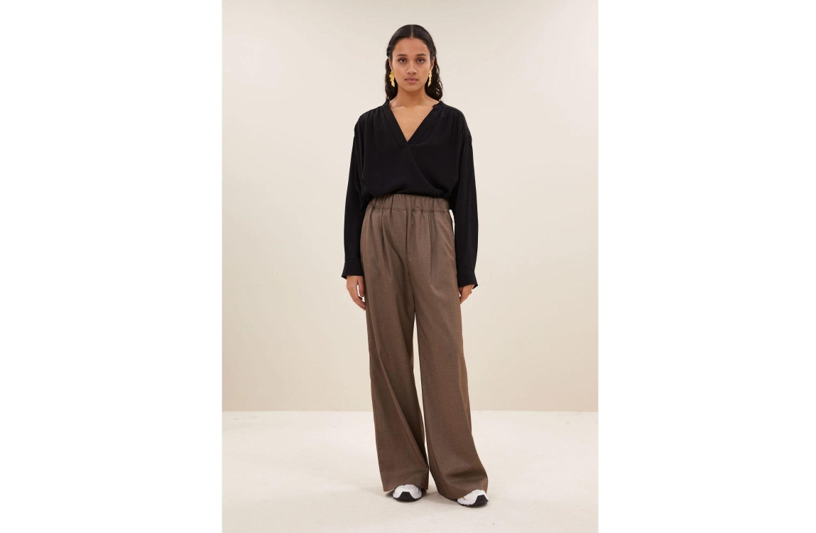 By-Bar Amsterdam Benji melange pants Biscuit melee. Dit wide leg model sluit door middel van een elastische boord en beschikt over twee steekzakken aan de voorzijde. Deze bruine pantalon van By-Bar is aan de boven- voorzijde afgewerkt met plooi details.