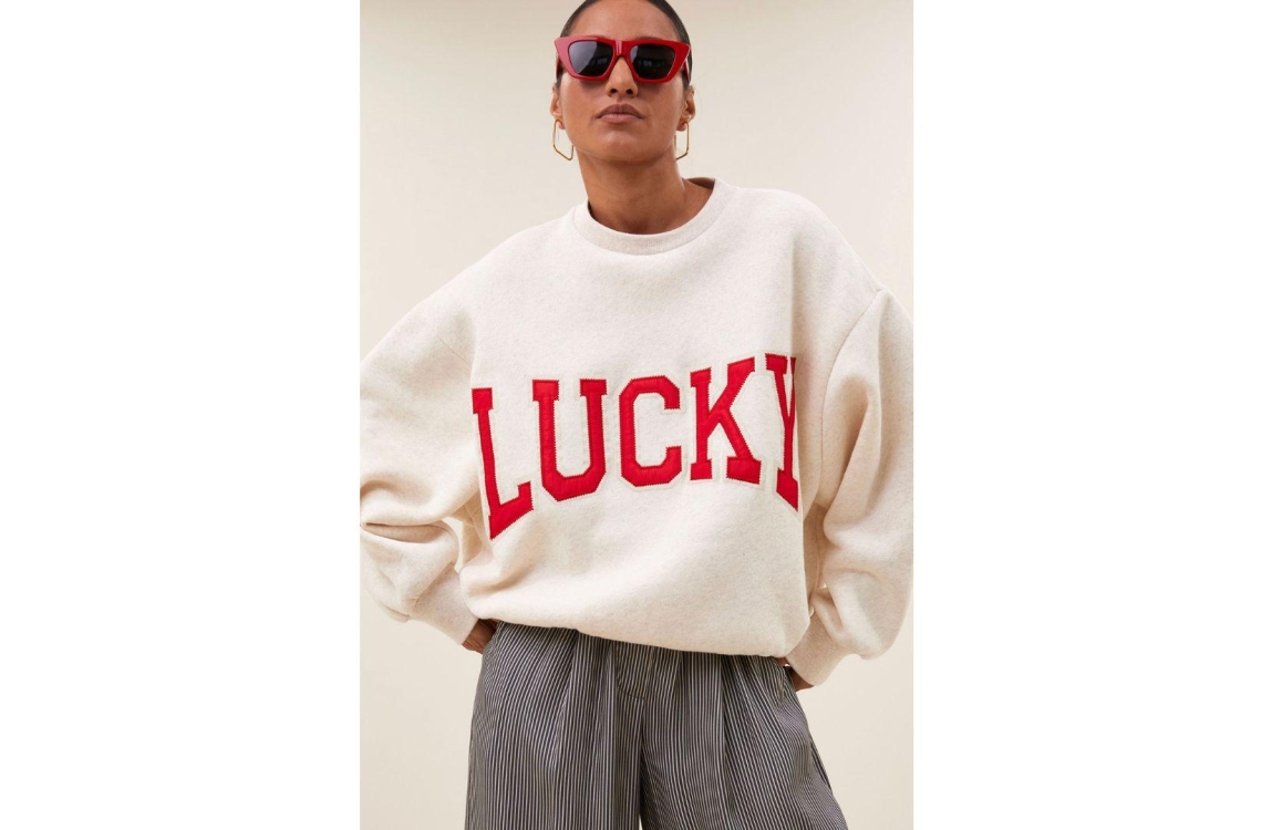 By-Bar Amsterdam bibi lucky patchwork sweater 26218903. Dit wijdvallend model heeft een ronde hals en lange mouwen met verlaagde schoudernaden. Deze beige sweater van By-Bar Amsterdam is op het voorpand bewerkt met een tekstopdruk 'LUCKY' en is afgewerkt met boorden.