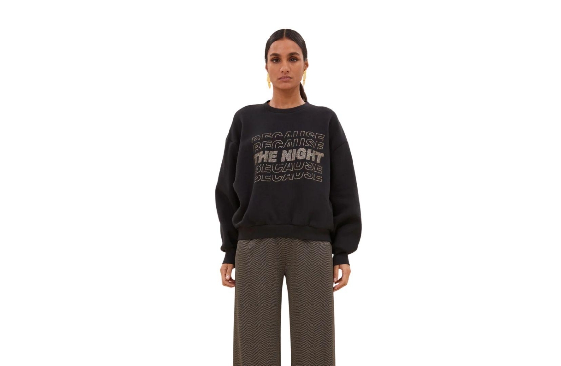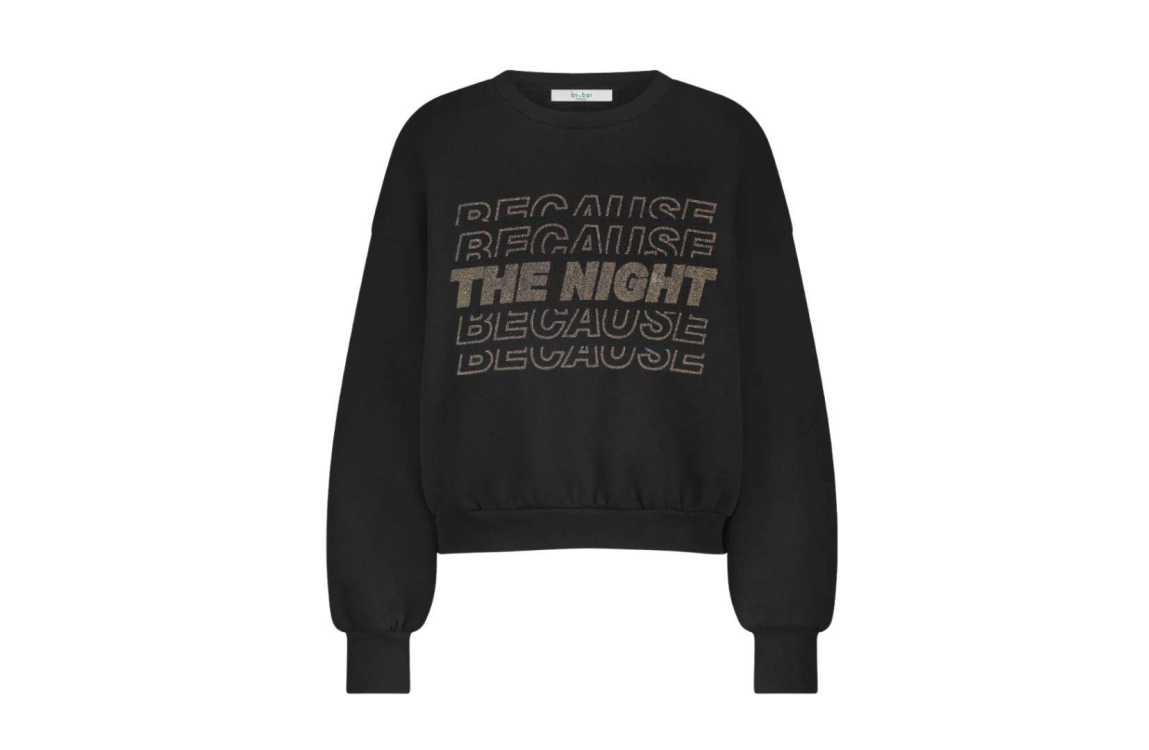 By-Bar Amsterdam Bibi patchwork sweater 25518905. Dit wijdvallend model heeft een ronde hals en lange mouwen met verlaagde schoudernaden. Deze donkergrijze sweater van By-Bar Amsterdam is op het voorpand bewerkt met een tekstopdruk met glitter en is afgewerkt met boorden. Het model is 175 centimeter, en draagt maat S
