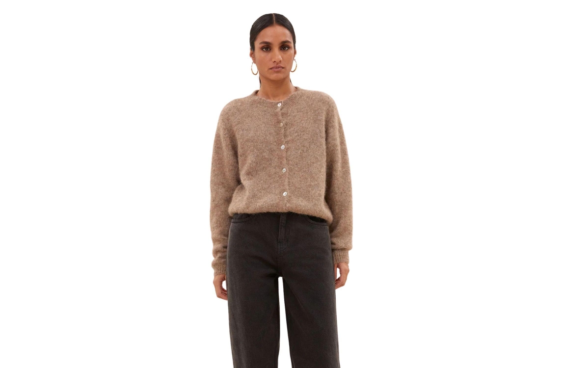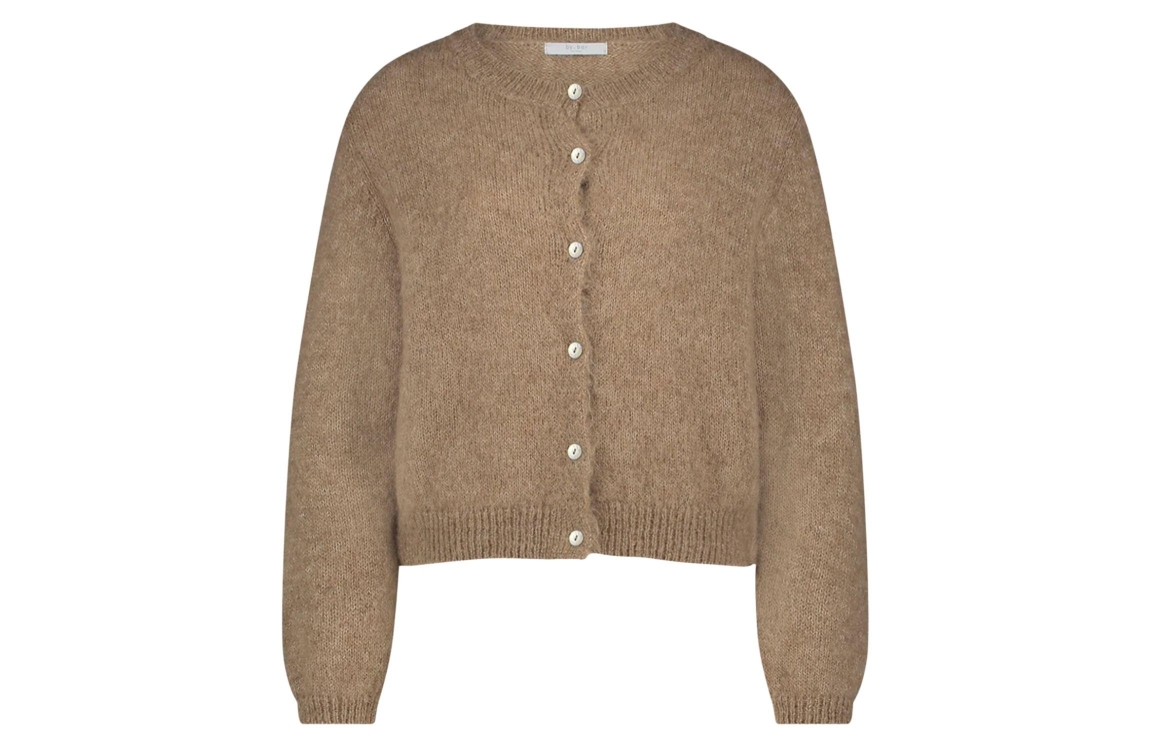 By-Bar Amsterdam 25514004 730. Dit rechtvallende model heeft een ronde halslijn en lange mouwen. Deze lichtbruine cardigan van By-Bar sluit aan de voorzijde door middel van knopen en is afgewerkt met ribgebreide boorden.