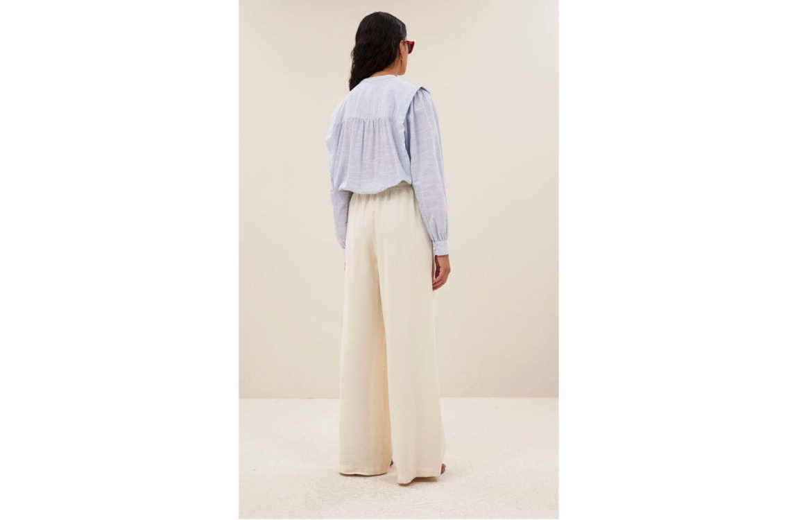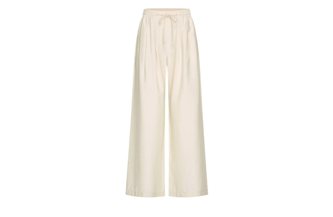 By-Bar Amsterdam Jaxx pants 26218012. Dit wide leg model sluit door middel van een elastische boord met trekkoorden en heeft twee steekzakken aan de voorzijde. Deze crèmekleurige luchtige broek van By-Bar is bewerkt met plooi details aan de voorzijde.