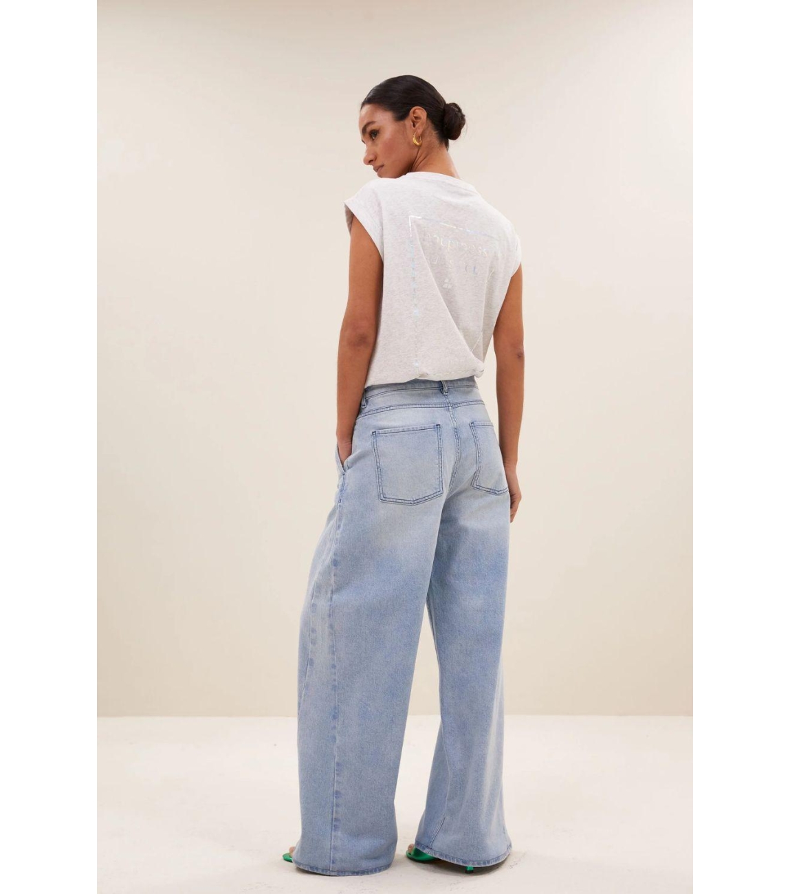 By-Bar Amsterdam Thelma mirror top 815. Dit rechtvallende model heeft kleine kapmouwtjes en een ronde hals. Deze grijze top van By-Bar is voorzien van een uniek graphic patroon op de achterzijde. Het model is 175 centimeter en draagt maat S.
