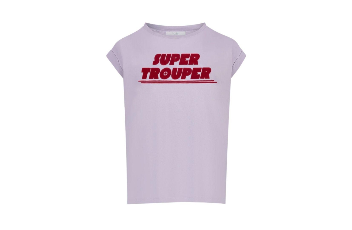 By-Bar thelma trouper top 25111022. Dit rechtvallende model heeft een ronde kals en kleine kapmouwtjes. Deze paarse top van By-Bar is bewerkt met een rode opdruk.