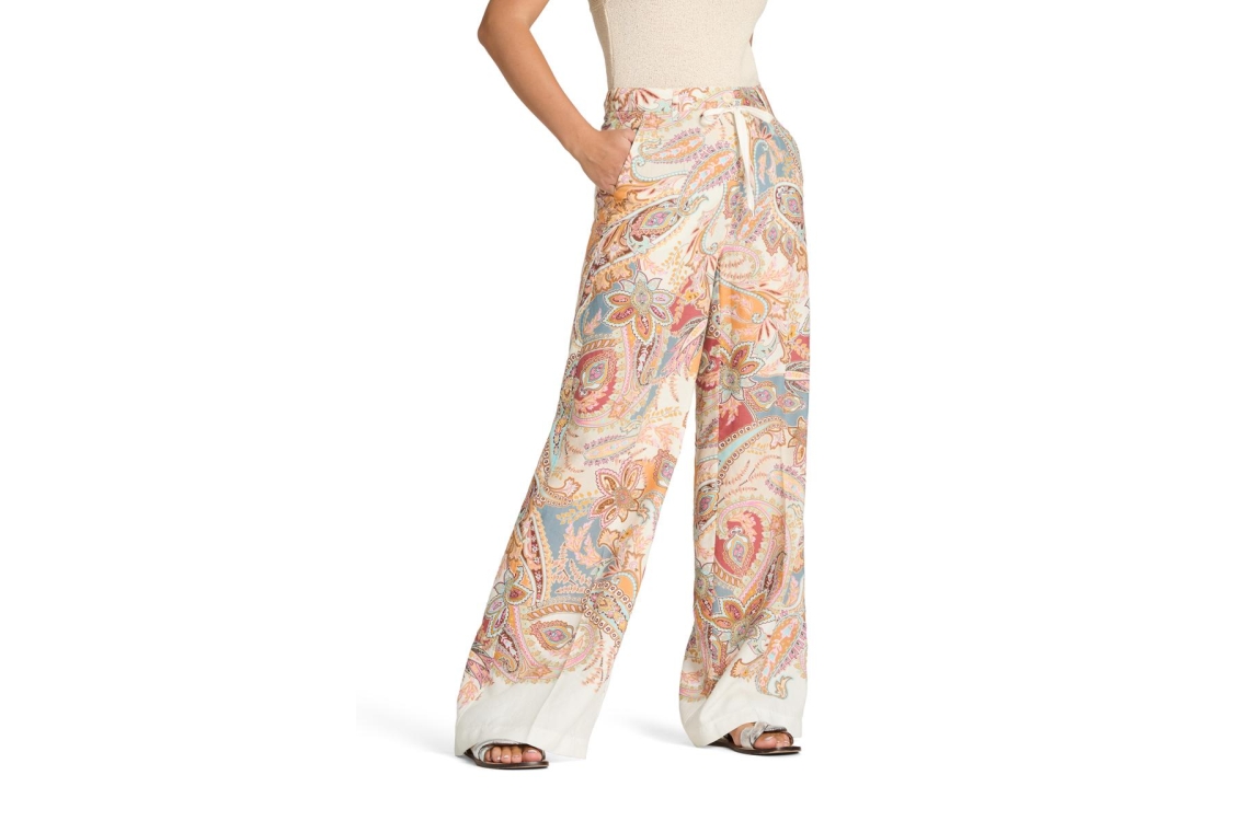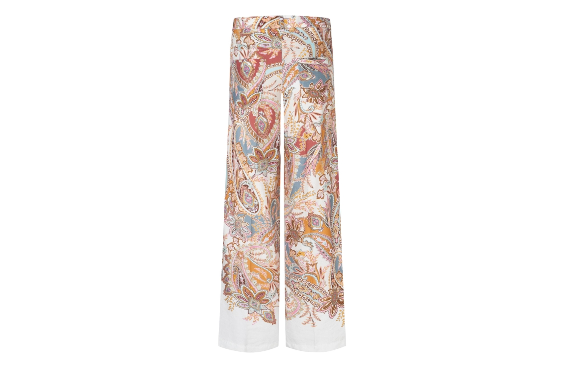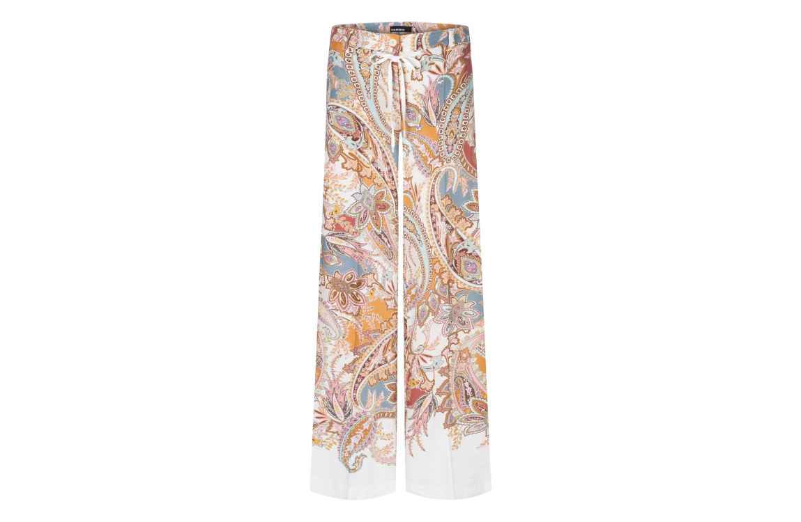 Cambio broek Adrienne 8729-0414-03 802. Dit wijdvallende model sluit door middel van een knoop- en ritssluiting met trekkoord. Deze multi-colour broek van Cambio is all-over bewerkt met een grafische print en is voorzien van twee steekzakken aan de voor- en achterzijde. Het model is afgewerkt met ceintuurlussen en een plooidetail over de lengte van de been.