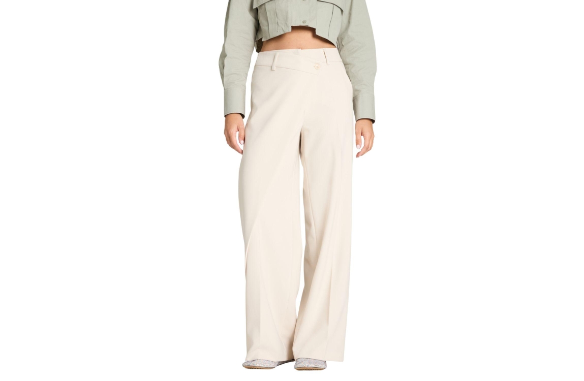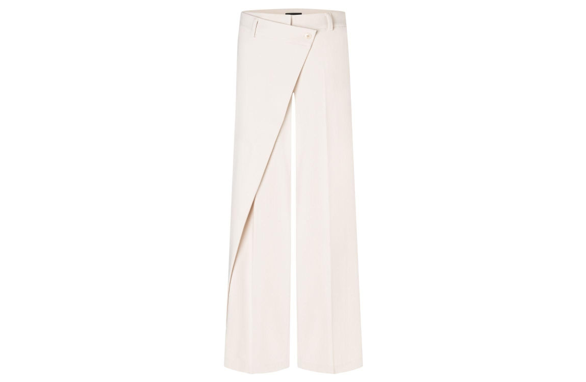 Cambio broek 6052-0430-00 702. Dit wide fit model sluit door middel van (schuif) knopen met ritssluiting en is voorzien van ceintuurlussen. Deze off white broek van Cambio beschikt over een steekzak aan de voorzijde en twee paspelzakken aan de achterzijde. Het model is asymmetrisch uitgevoerd en is gedetailleerd met een overlapping wrap aan de voorzijde.