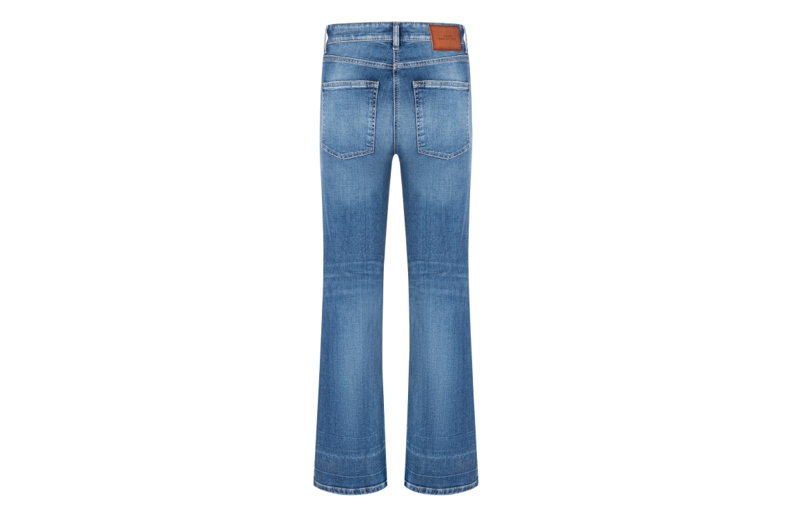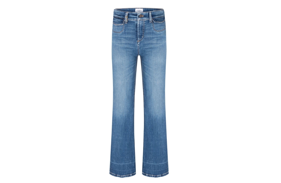 Cambio Fabienne pocket 5159 Summer modern used blue denim. Dit flared model sluit door middel van een knoop en rits en heeft ceintuurlussen. Deze blauwe jeans is afgewerkt met zakken aan de achterzijde. Aan de voorzijde is deze jeans afgewerkt met sierzakken.