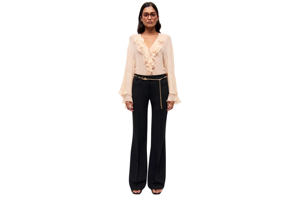 Cambio 6248-0483-02 099. Dit flared-fit model sluit door middel van (schuif) knopen met ritssluiting en is voorzien van ceintuurlussen. Deze zwarte broek van Cambio is voorzien van twee kleine klepzakken aan de voorzijde en twee paspelzakken aan de achterkant. Het model is gedetailleerd met een goudkleurige ceintuur met het 'CAMBIO' merkembleem.