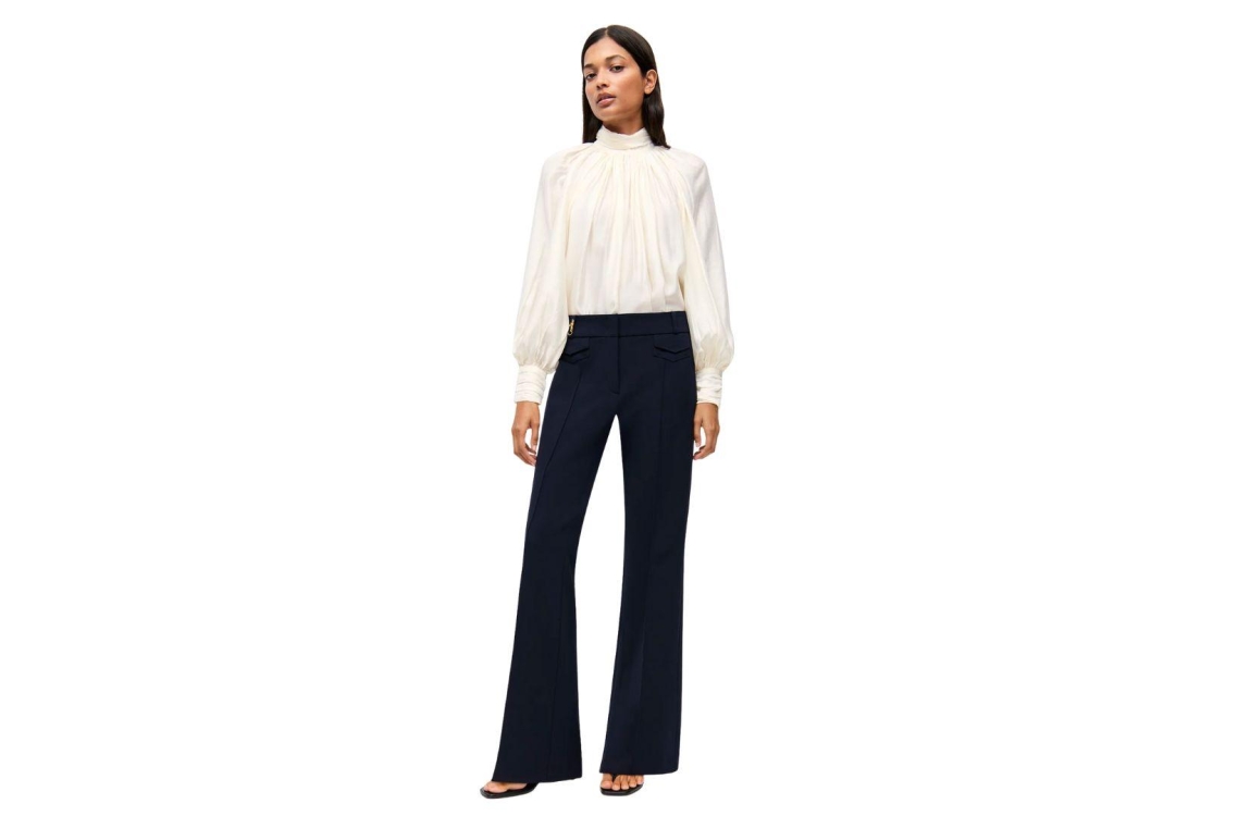 Cambio broek 6316-0483-00 489. Dit flared fit model sluit door middel van schuifknopen met rits en is voorzien van ceintuurlussen. Deze donkerblauwe broek van Cambio is voorzien van twee kleine klepzakken aan de voorzijde en twee paspelzakken aan de achterzijde. Het model is afgewerkt met een plooi over de lengte.