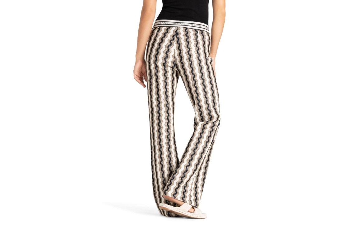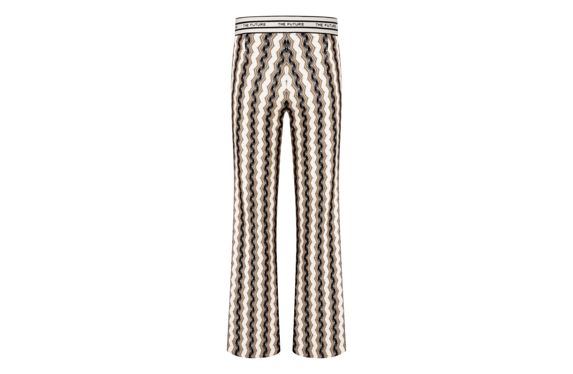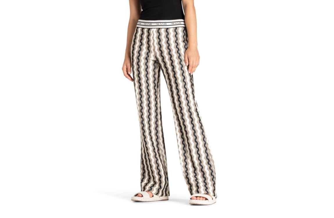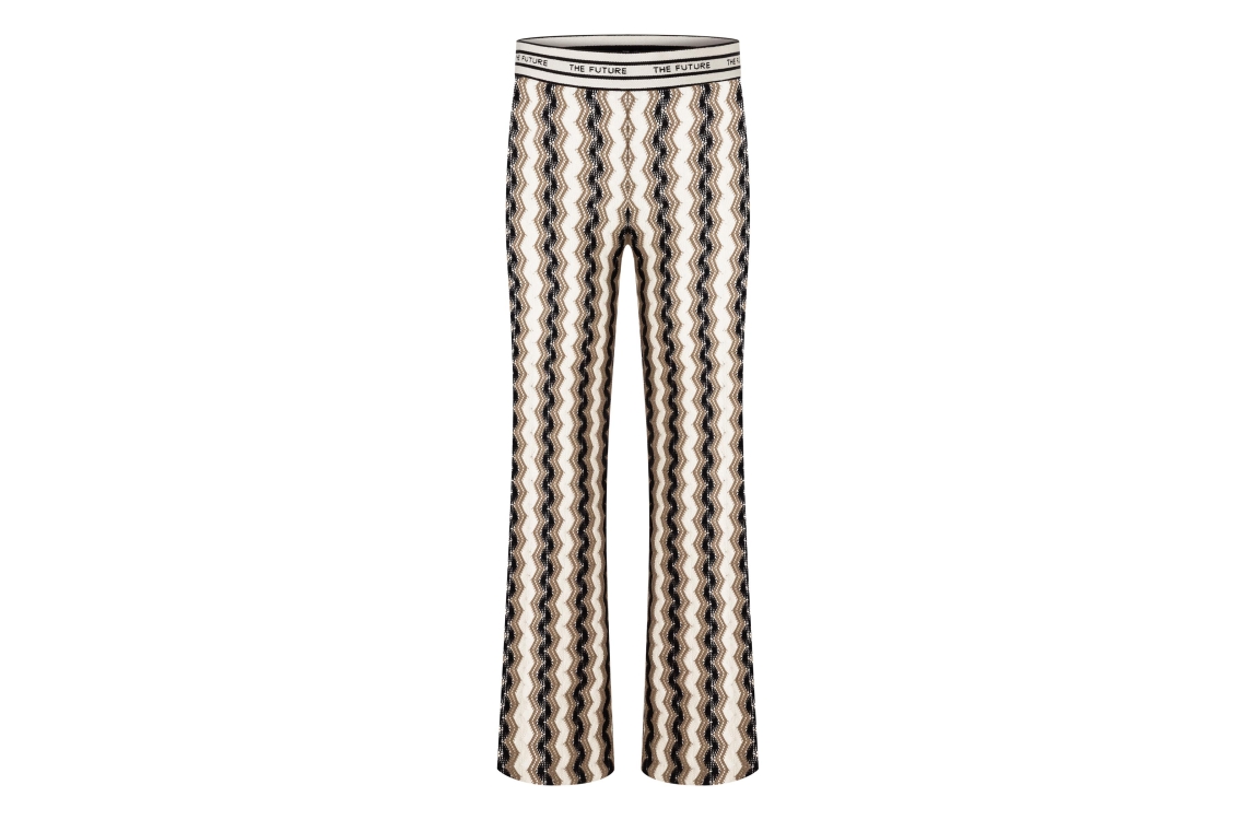 Cambio broek Francis 6608-0378-11. Dit flared model is voorzien van een gehaakt patroon op de gehele broek in de kleuren groen, zwart en wit. Deze zwarte broek van Cambio sluit door middel van een elastische boord met tekst.