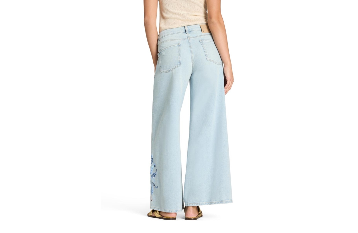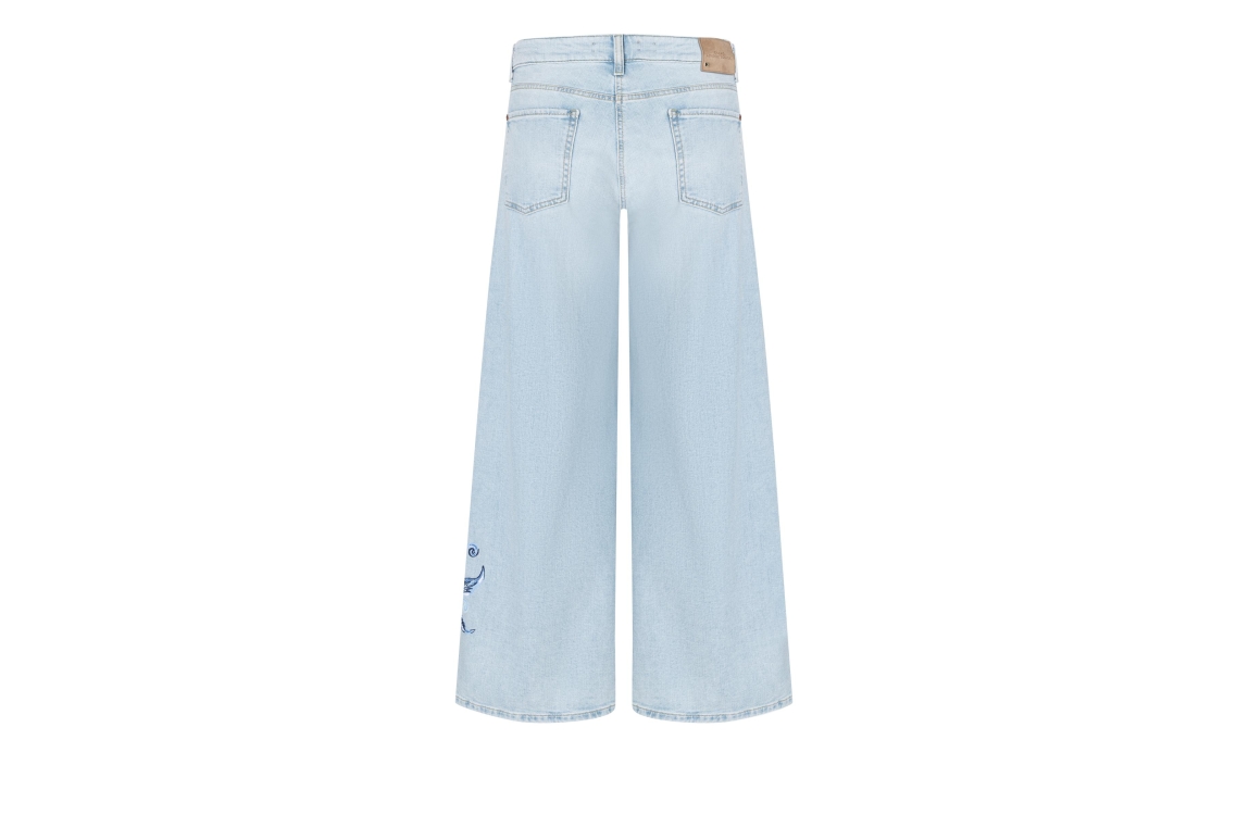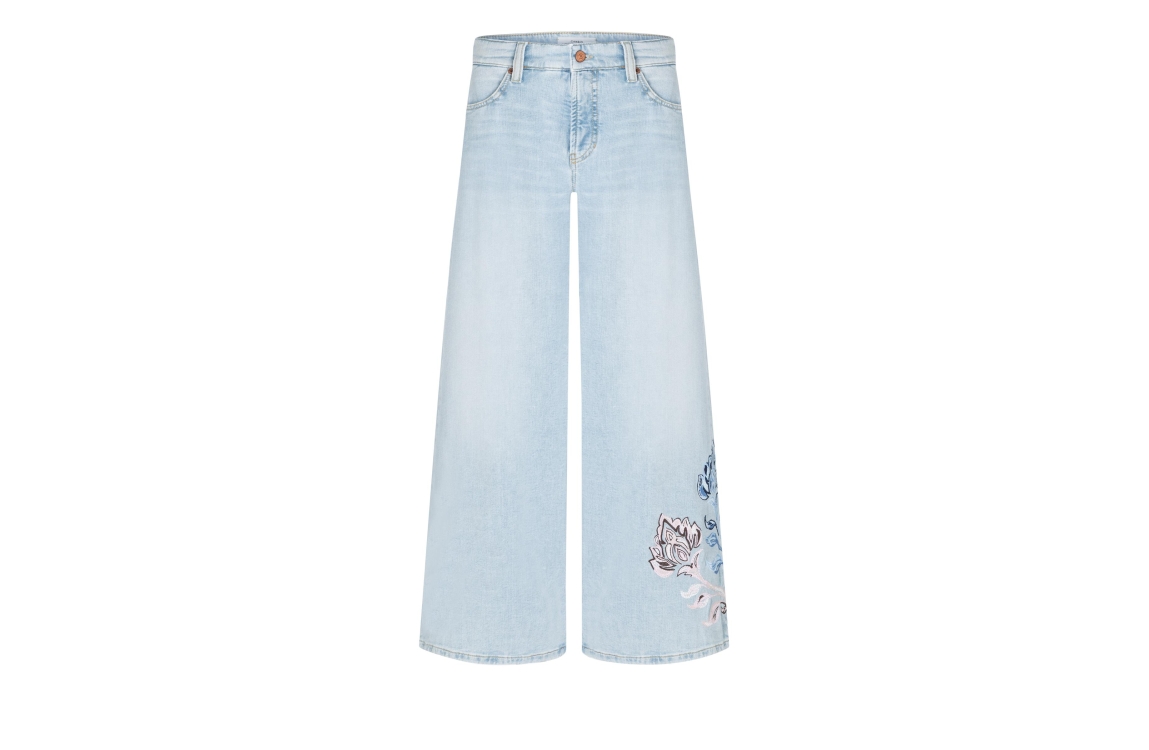 Cambio Palazzo jeans 9132-0023-16. Dit wijdvallend model sluit door middel van een knoop en een rits. Deze lichtblauwe denim jeans van Cambio is voorzien van een bloemenmotief aan de onderzijde en afgewerkt met riemlusjes en 5-pocket broekzakken.