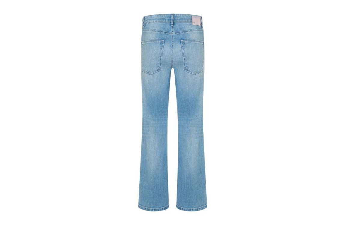 Cambio broek 9118-0097-03. Dit flared fit model sluit door middel van een knoop- en ritssluiting en is voorzien van ceintuurlussen. Deze denim broek van Cambio is uitgevoerd in een 5-pocketmodel en is afgewerkt met een plooi over de lengte van de been.
