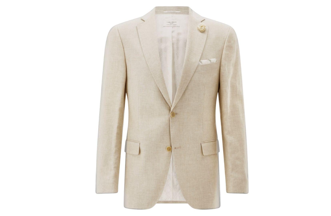 Carl Gross colbert Tannon. Dit slim fit model heeft een reverskraag en lange mouwen. Deze beige colbert van Carl Gross heeft 2 klepzakken, een borstzak en 3 binnenzakken, heeft een gewoven structuur en sluit door knopen.