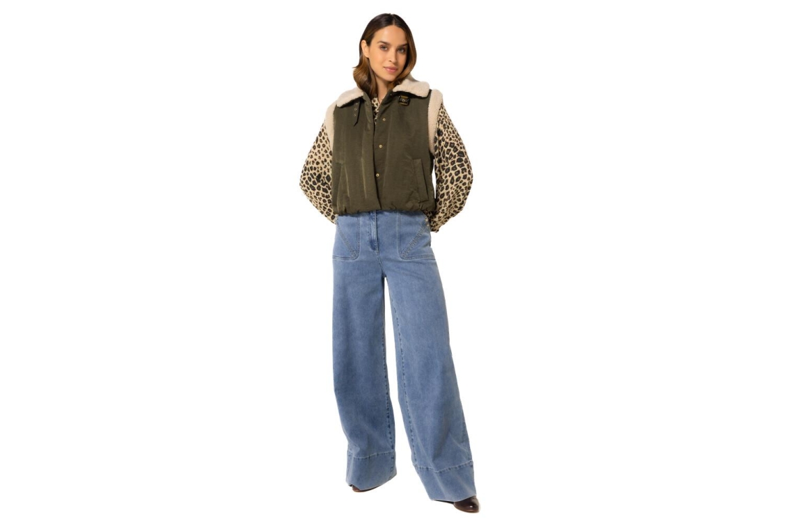 Caroline Biss Jeans 4500/25. Dit wijdvallende model sluit aan de bovenzijde door middel van een knoop en rits. Deze licht blauwe jeans van Caroline Biss is bewerkt met zakken op het voorpand, gouden details en een grove omslag aan de onderzijde. Deze jeans bevat een beetje stretch en beschikt over riemlusjes.