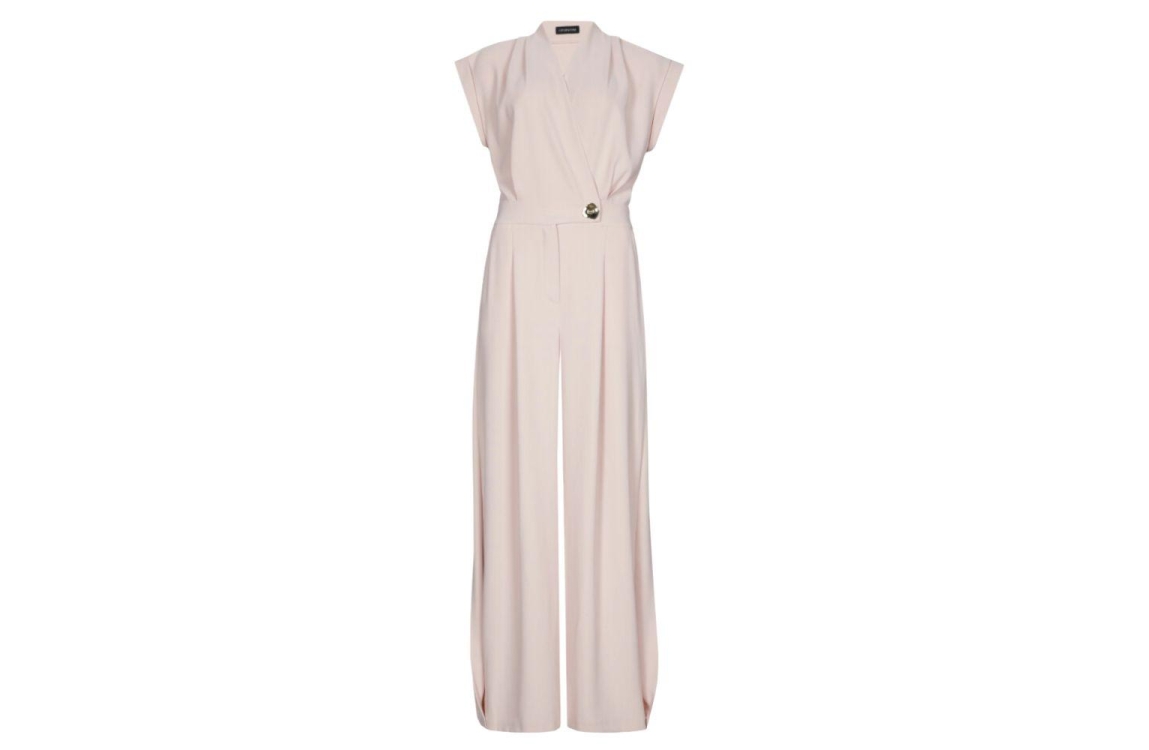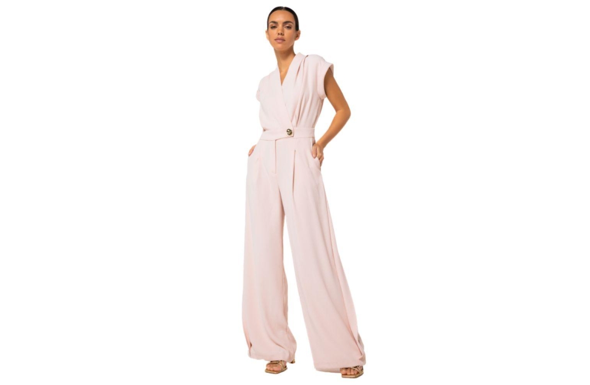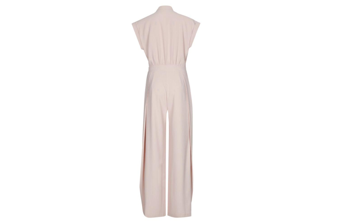 Caroline Biss jumpsuit 1505/74. Dit regular fit model met wijde broekspijpen heeft een V-hals en is mouwloos. Deze beigekleurige jumpsuit van Caroline Biss sluit aan de voorzijde door middel van een goudkleurige knoop met ritssluiting en is voorzien van twee steekzakken. Het model is uitgevoerd in crêpe kwaliteit en heeft een lichtroze ondertoon.