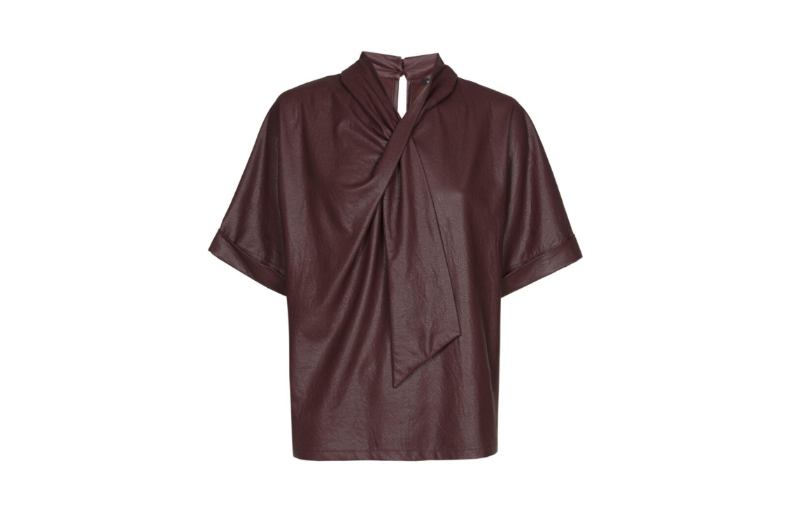 Caroline Biss Top vegan leather 55 Wine. Dit rechtvallende model heeft een V-hals en korte mouwen met een omslagboord. Deze rode top van Caroline Biss heeft een druppelsluiting met knopen aan de achterzijde. Dit model heeft een strik detail aan de voorzijde en is uitgevoerd in vegan leather.