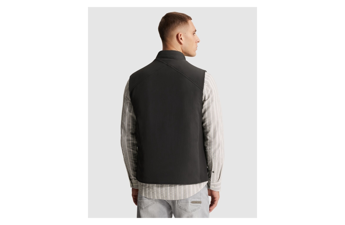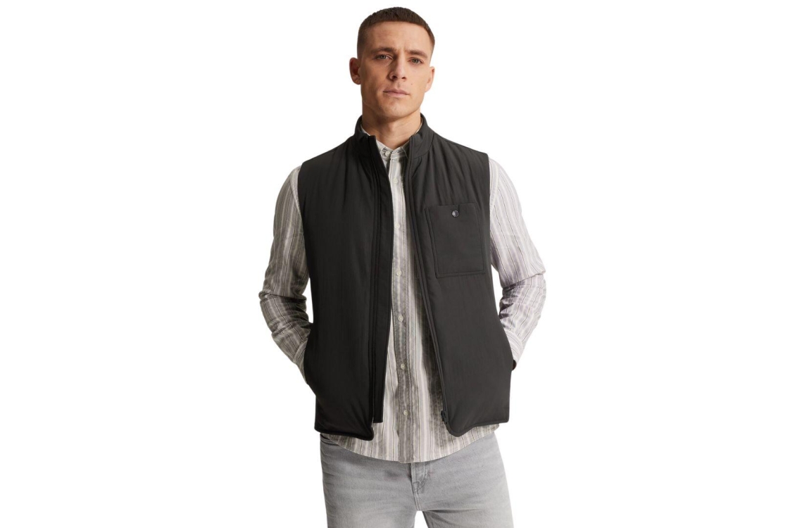 Cast Iron bodywarmer CBW2602140 9159. Dit rechtvallende model heeft een opstaande kraag en is mouwloos. Deze zwarte/grijze bodywarmer van Cast Iron sluit aan de voorzijde door middel van een rits en is voorzien van twee ritszakken en een sluitbare borstzak.
