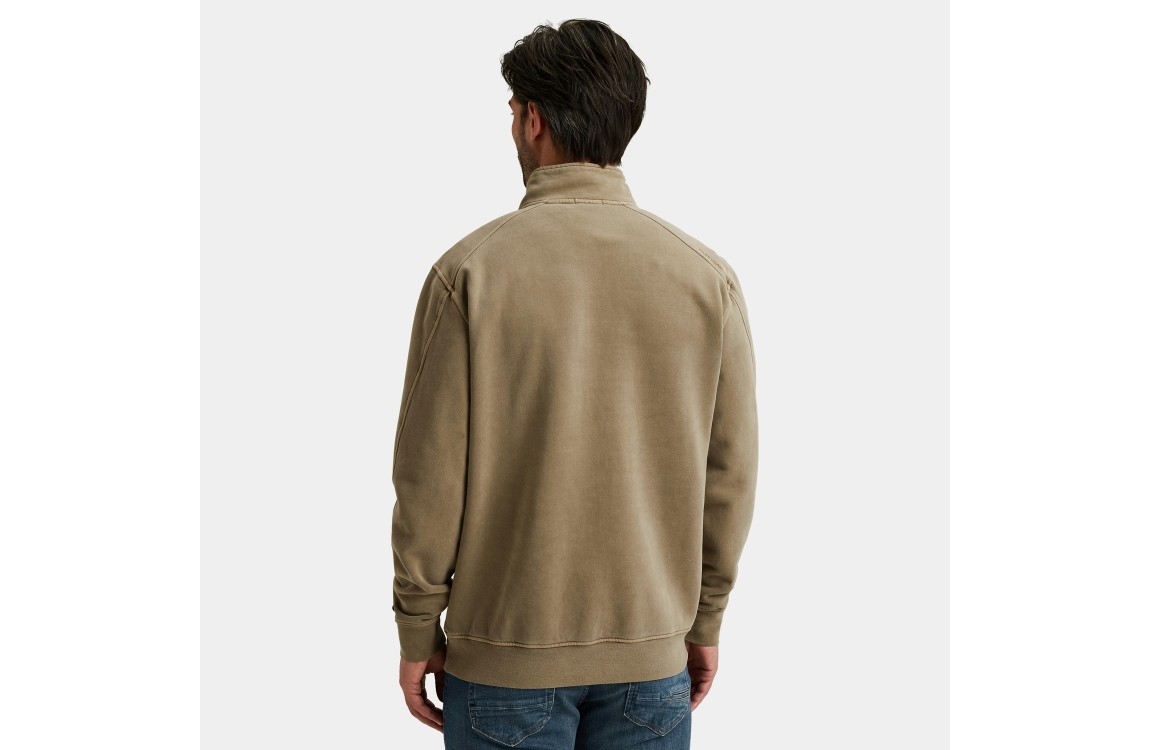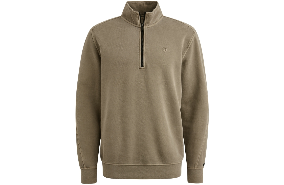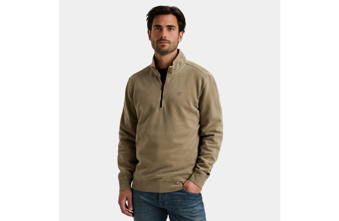 Cast iron pullover half zip CSW2508443. Dit rechtvallende model heeft turtle kraag en sluit door een half zip. Deze bruine pullover van Cast Iron heeft elastische boorden en een logo op de borst