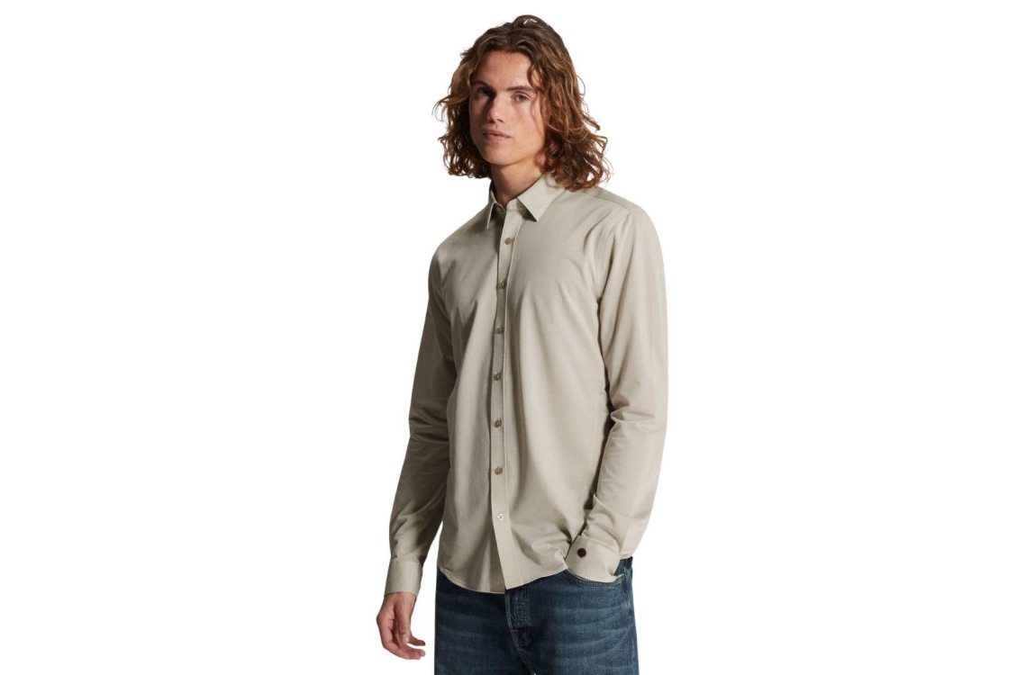 Cast Iron long sleeve Tec Fine Jersey CSI2603221. Dit slim fit model is voorzien van een kraag en heeft lange mouwen afgewerkt met een split en knopen. Dit bruin/beige kleurige shirt van Cast Iron sluit aan de voorzijde door middel van knopen.