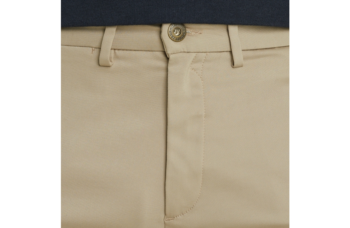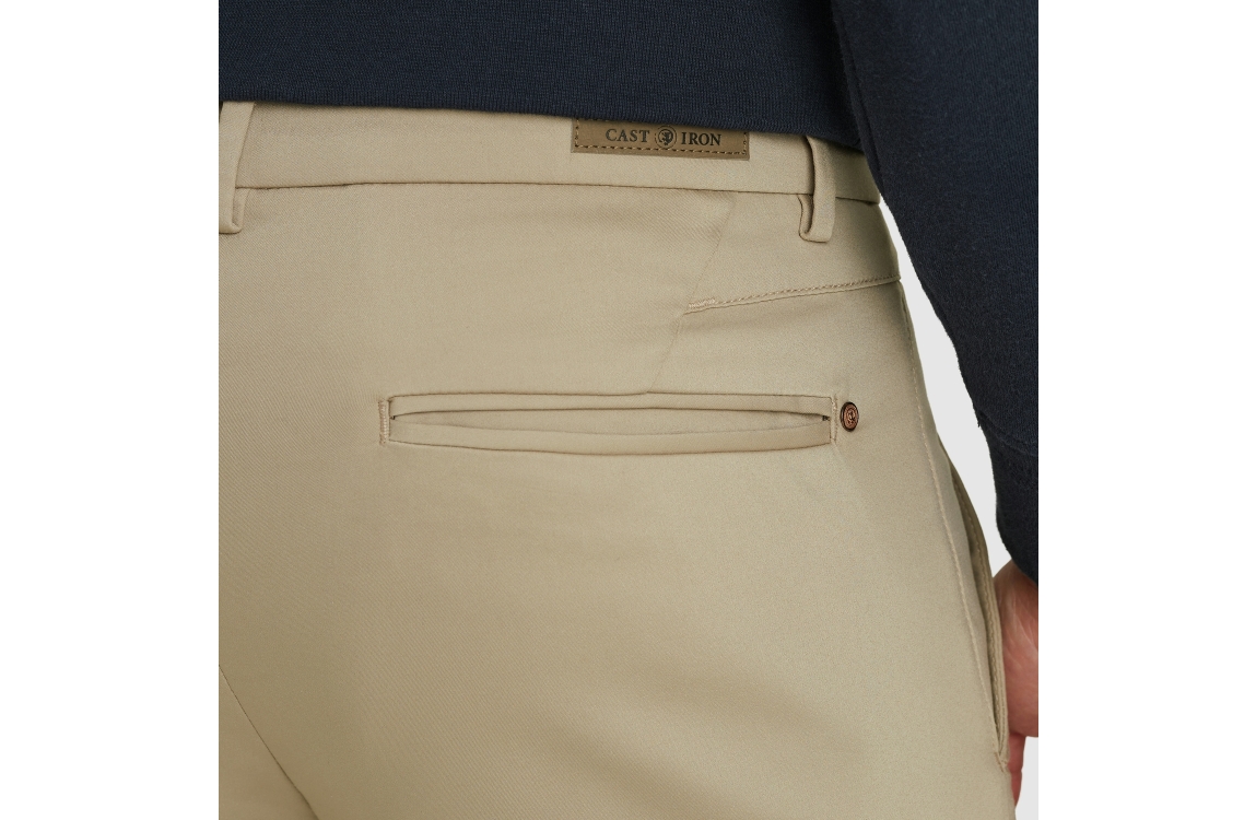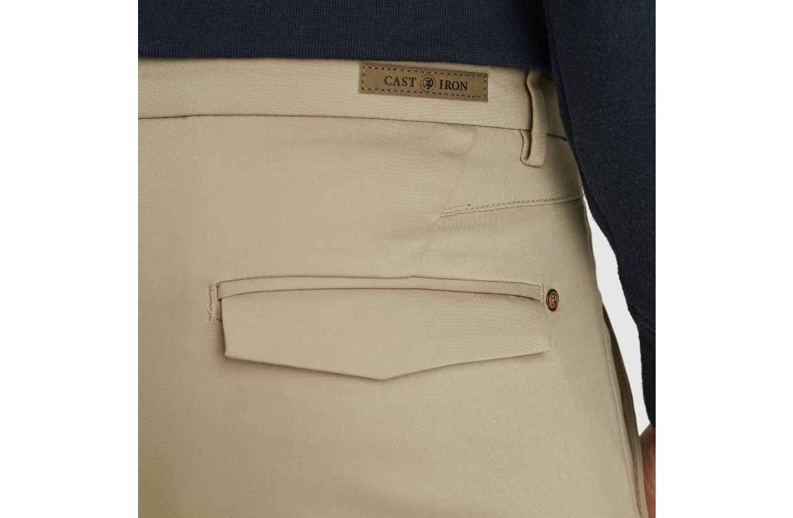 Cast Iron RISER CHINO stretch CTR2508600-7146. Dit regular fit model sluit door middel van een knoop en rits. Deze beige chino van Cast Iron is voorzien van steek en klep-zakken, riemlusjes en gemaakt van een stretch materiaal en hierdoor soepel draagbaar.