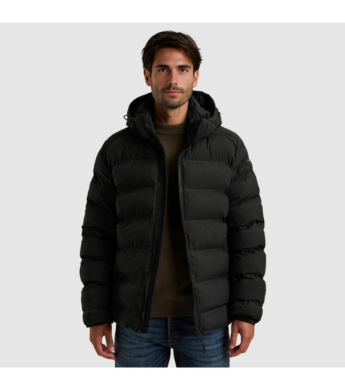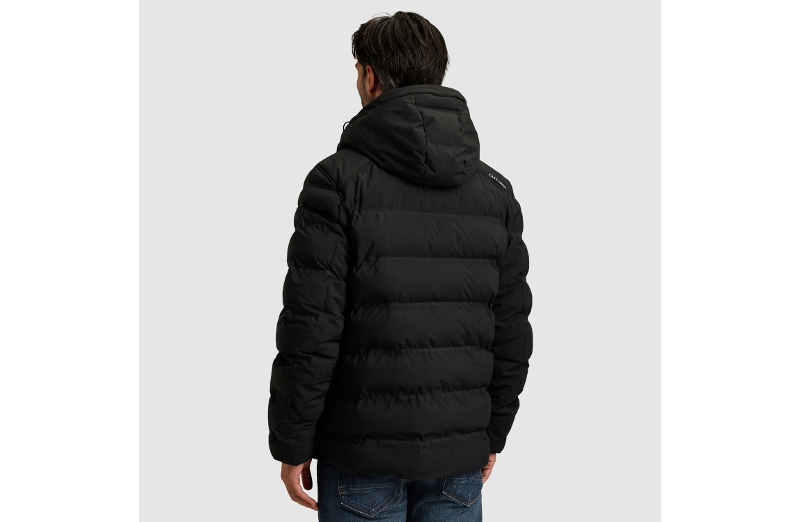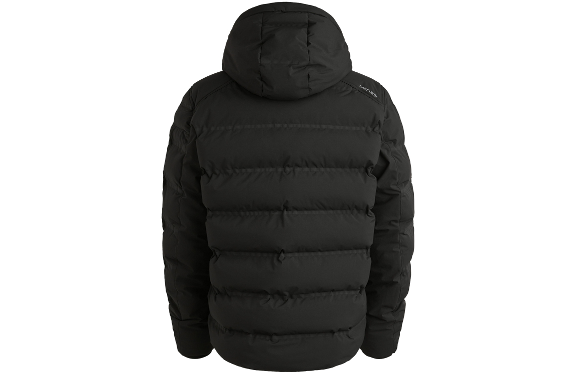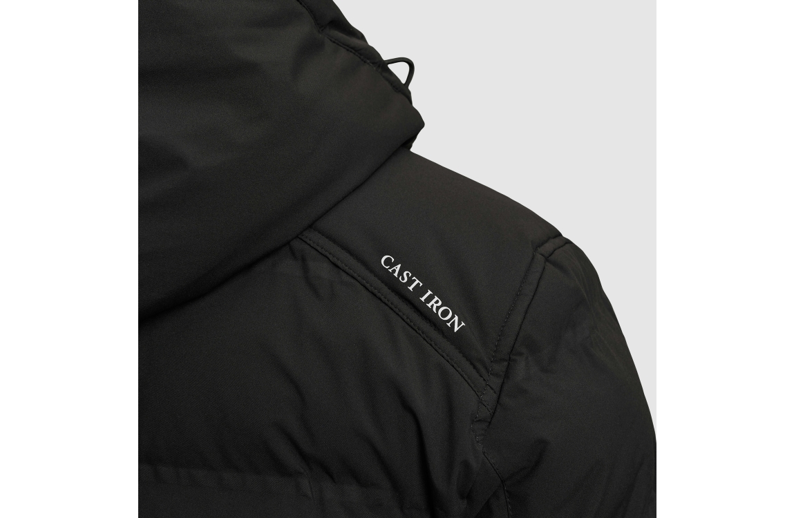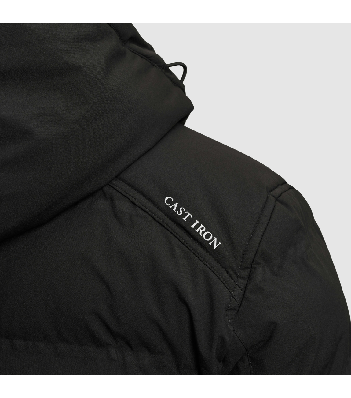 Cast Iron jas CJA2509145. Dit rechtvallende model heeft een opstaande kraag met afneembare capuchon en lange mouwen. Deze zwarte jas van Cast Iron sluit aan de voorzijde door middel van een rits en is voorzien van twee knoopzakken en een ritszak. Het model is op de linker- mouw en schouder gedetailleerd met het merkembleem.