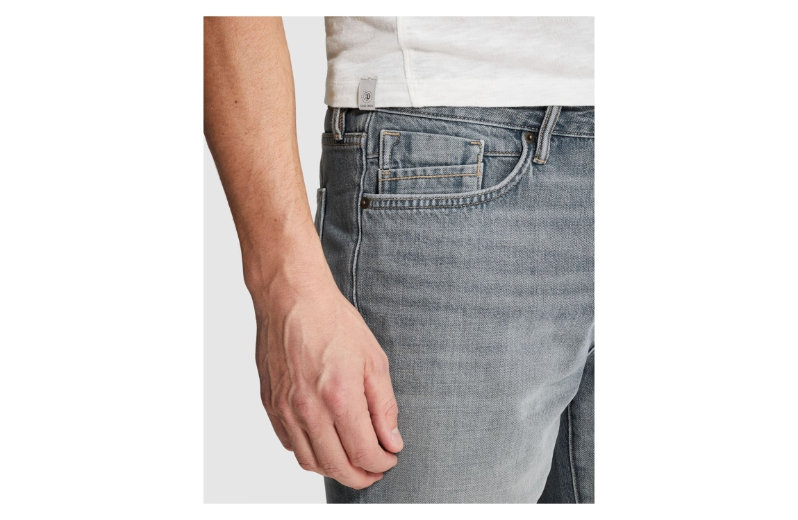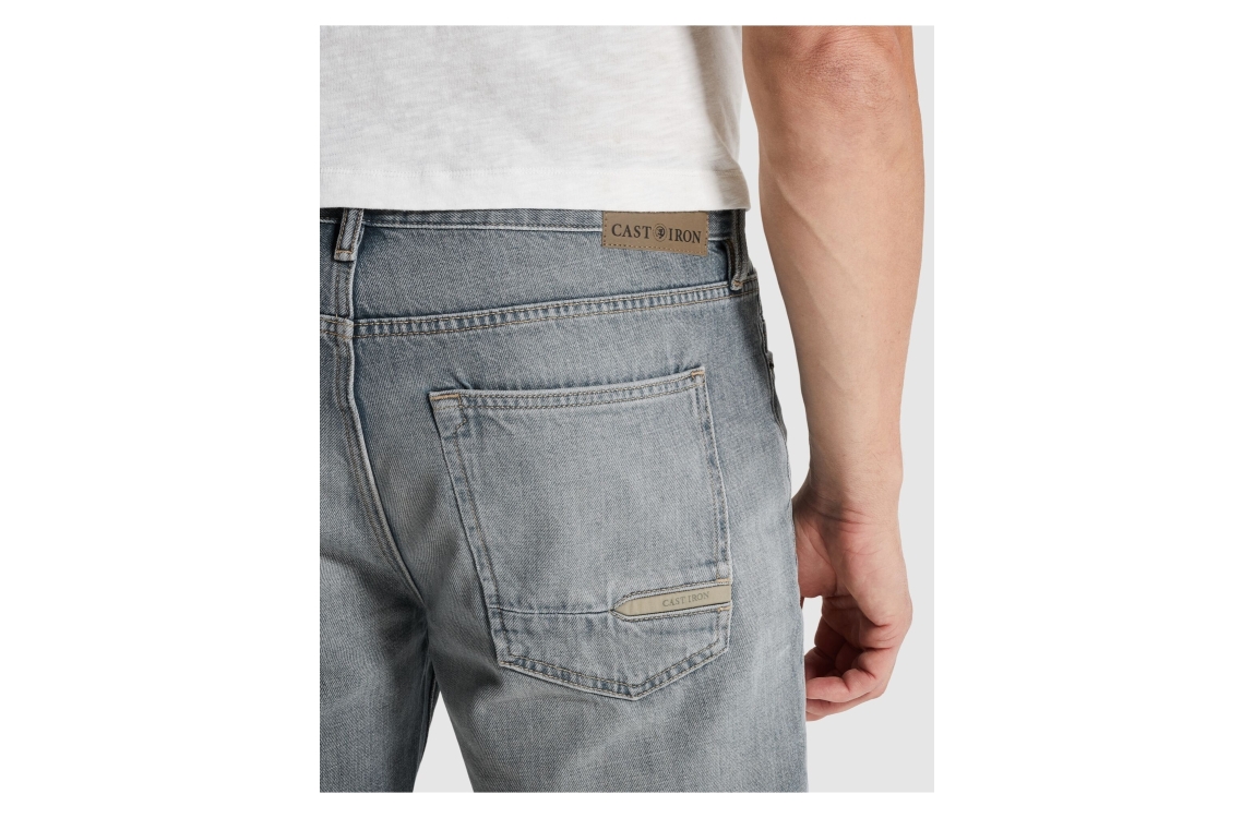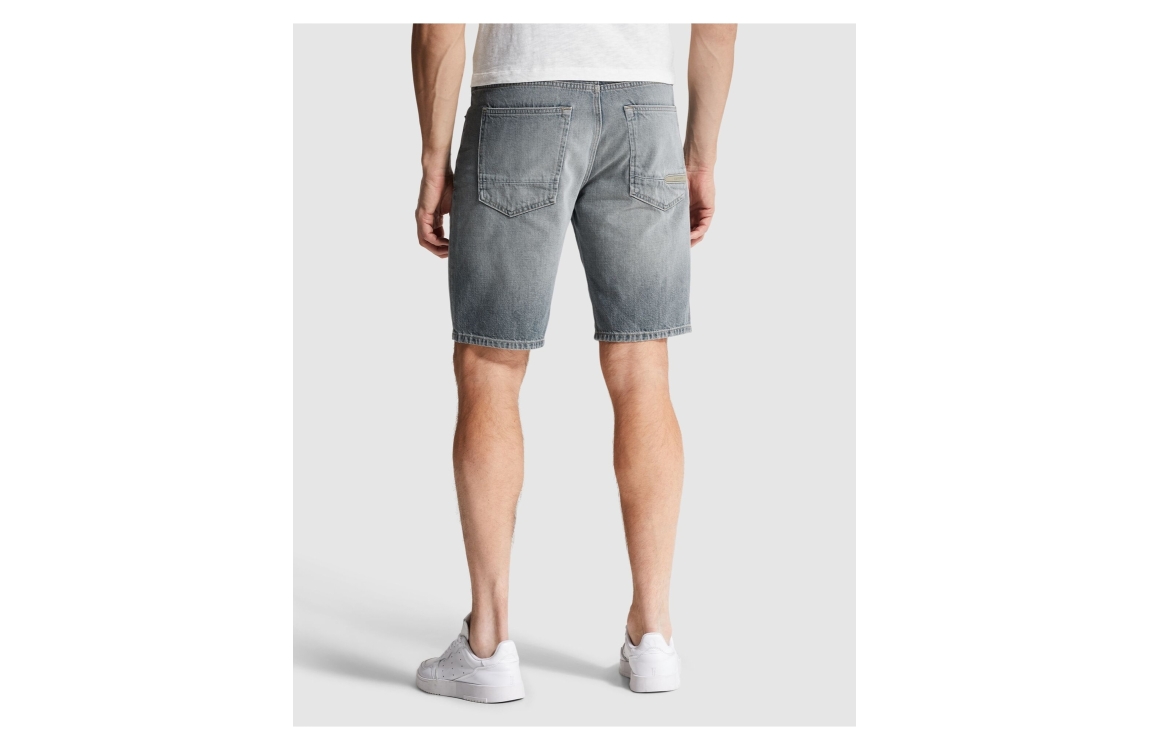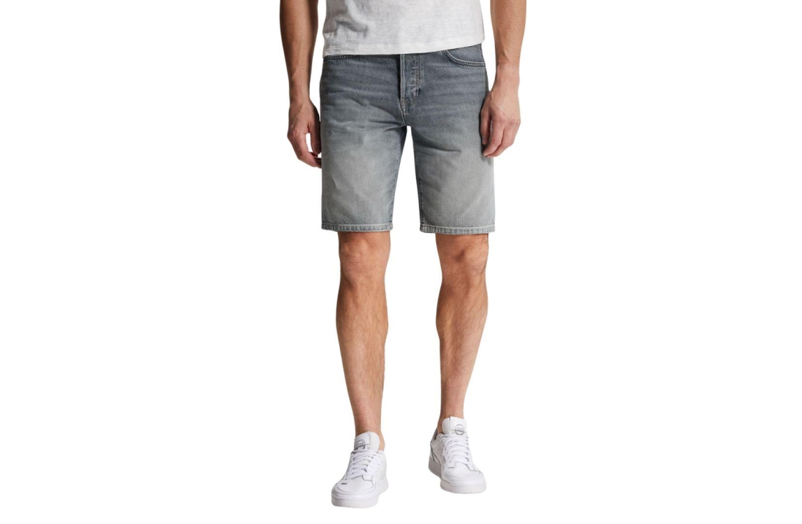 Cast Iron Valver short CSH2603655. Dit rechtvallend model sluit door middel van een knoop en rits afgewerkt met ceintuurlussen. Deze grijs/blauwe denim short van Cast iron is uitgevoerd in een 5-pocket model.