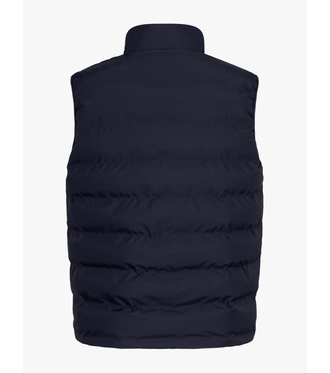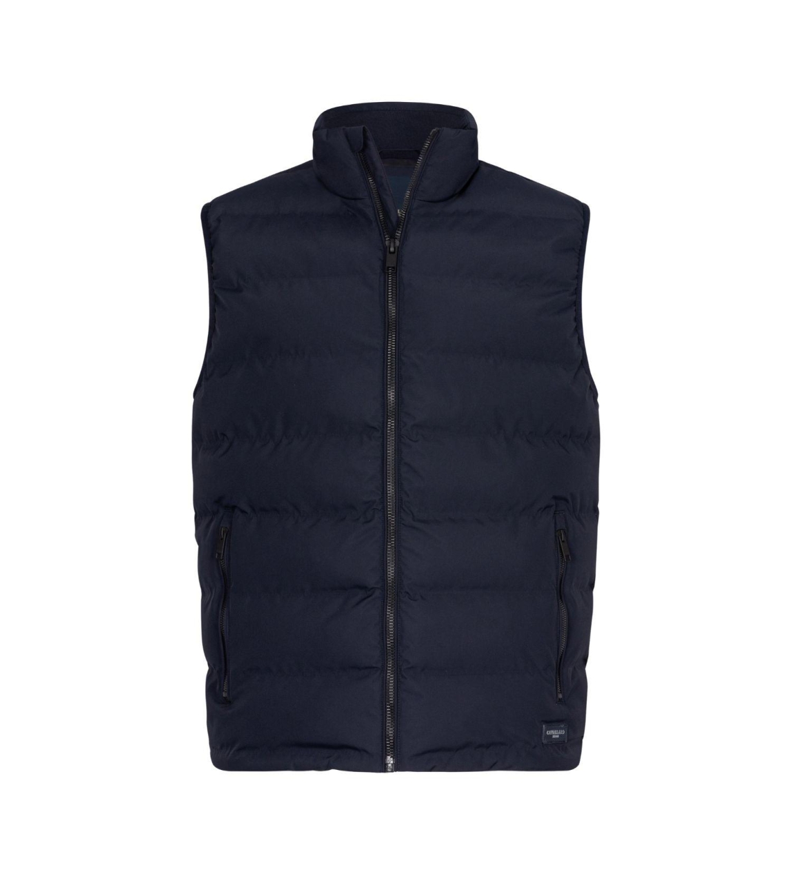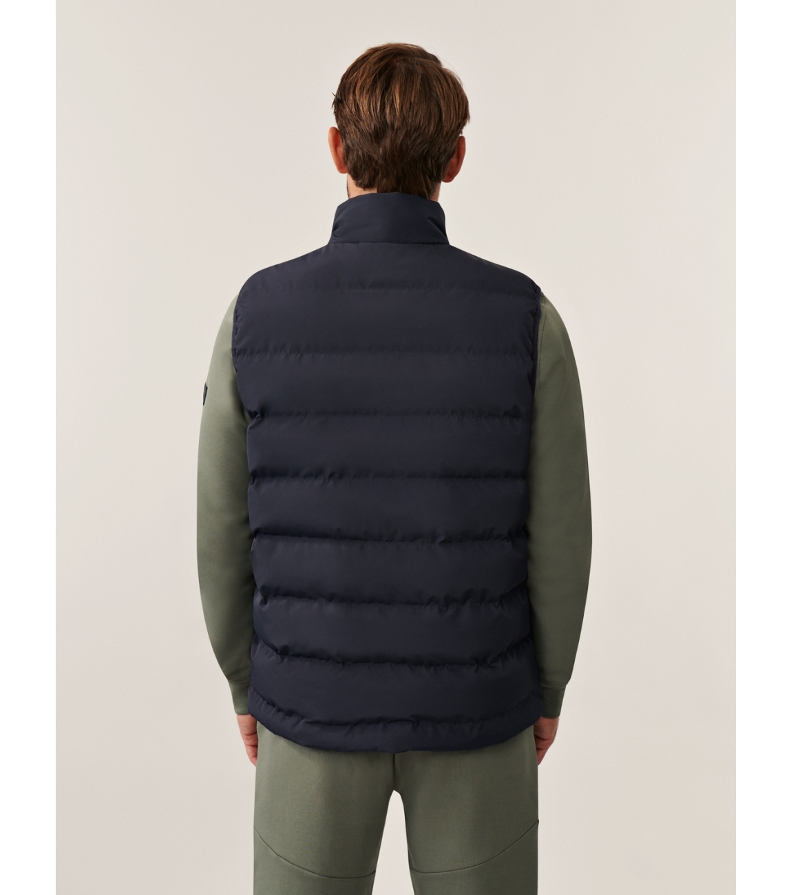 Cavallaro Cesario Bodywarmer 699000 Dark blue. Dit rechtvallende model is voorzien van een ronde hals met opstaande kraag en is mouwloos. Deze donker blauwe bodywarmer van Cavallaro sluit door middel van een rits en is afgewerkt met twee zakken met rits.