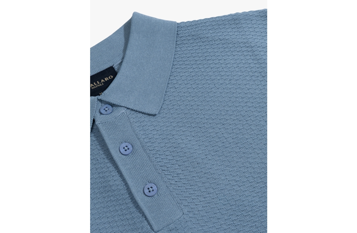 Cavallaro Milanio polo 116261010. Dit rechtvallend model is voorzien van een kraag en heeft korte mouwen. Deze lichtblauwe polo van Cavallaro sluit door middel van knopen en is all-over uitgevoerd in een structuur.