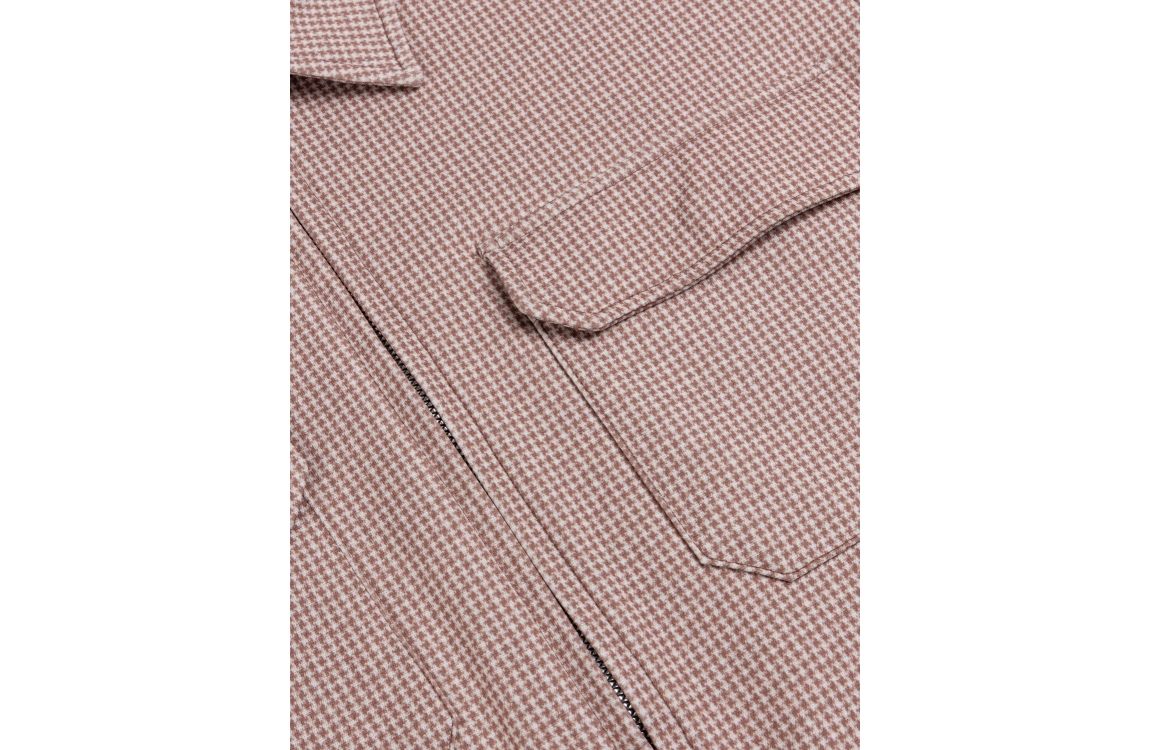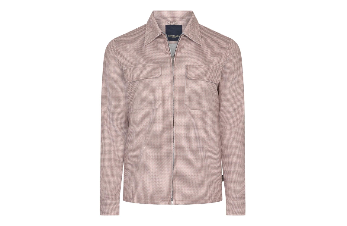 Cavallaro Ponzo Overshirt 310007 Old pink. Dit rechtvallende model heeft een kraag en lange mouwen. Deze oud roze overhemd van Cavallaro sluit aan de voorzijde met een rits en is voorzien van twee opgestikte klepzakken met drukknoopsluiting op de borst. Dit model is uitgevoerd in een pied-de-poule print.