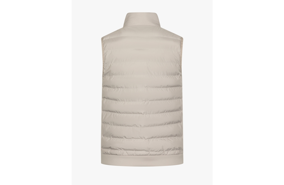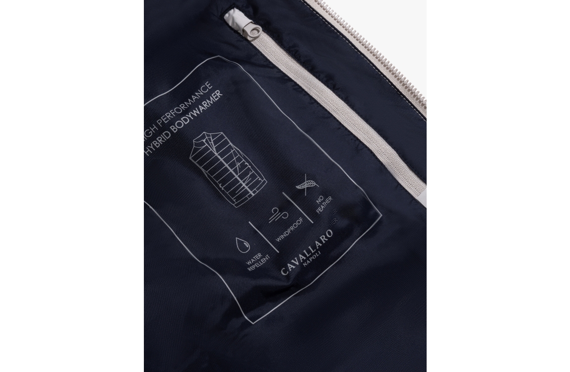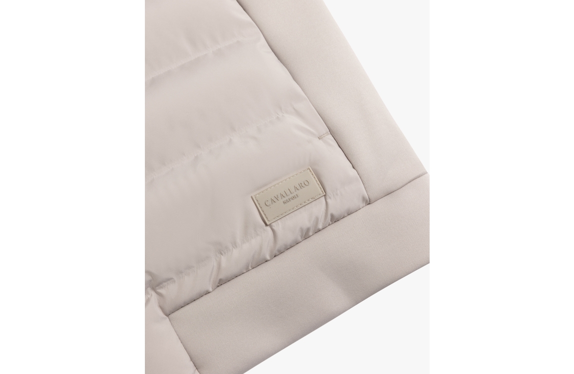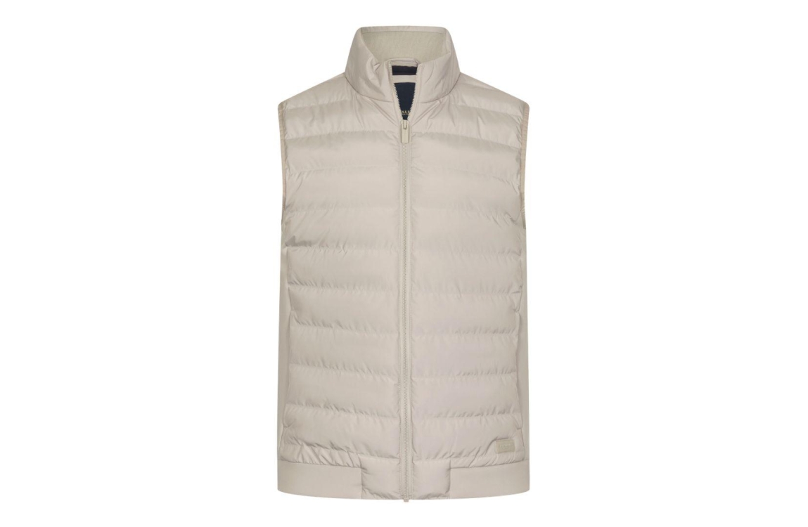 Cavallaro bodywarmer Quintino 112261030. Dit rechtvallend model is voorzien van een ronde kraag en is mouwloos. Deze kitkleurige gewatteerde bodywarmer van Cavallaro sluit door middel van een rits en beschikt over twee ritszakken.