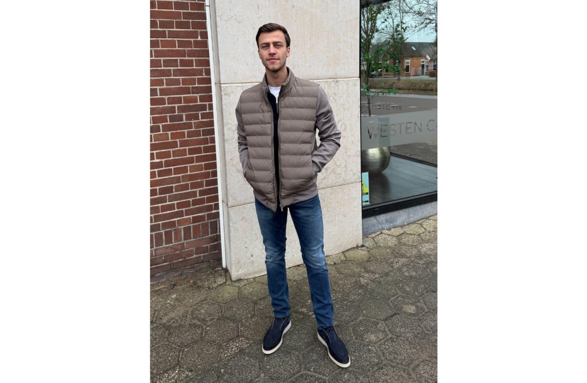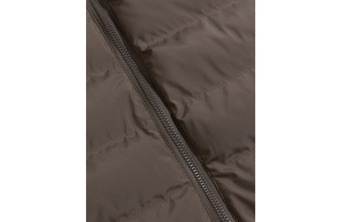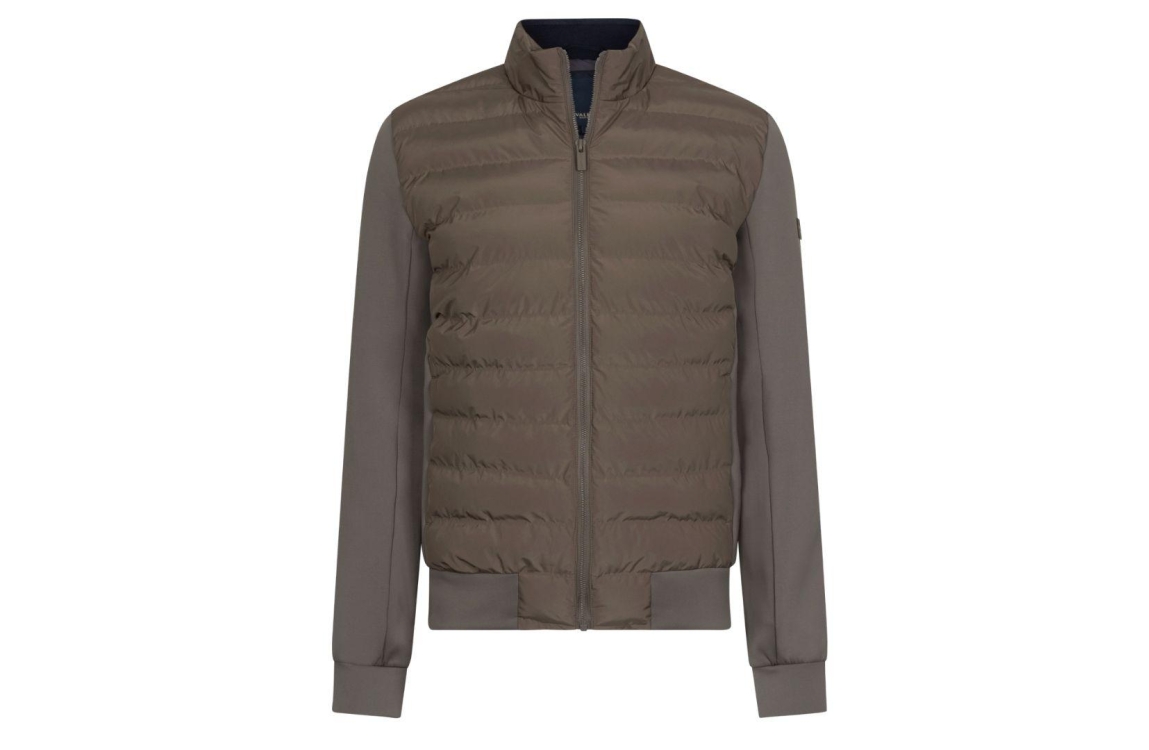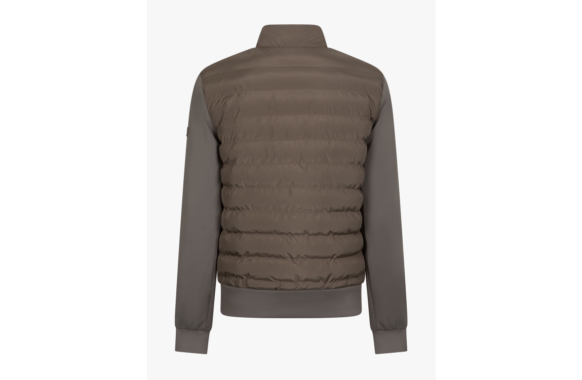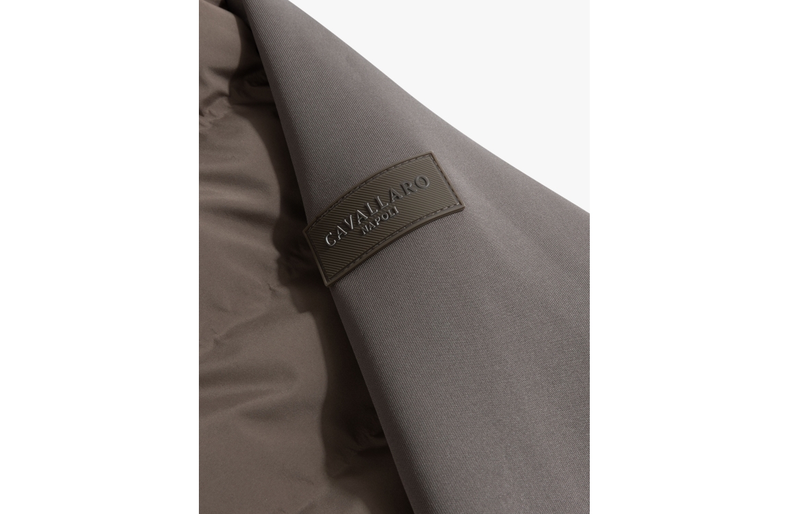 Cavallaro jacket Quintino 112261013. Dit rechtvallend model is voorzien van een ronde kraag en heeft lange mouwen. Deze taupekleurige jas van Cavallaro sluit door middel van een rits en beschikt over twee ritszakken. Dit model is bij de romp gewatteerd uitgevoerd en is op de schouder afgewerkt met het logo.