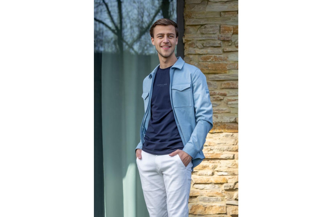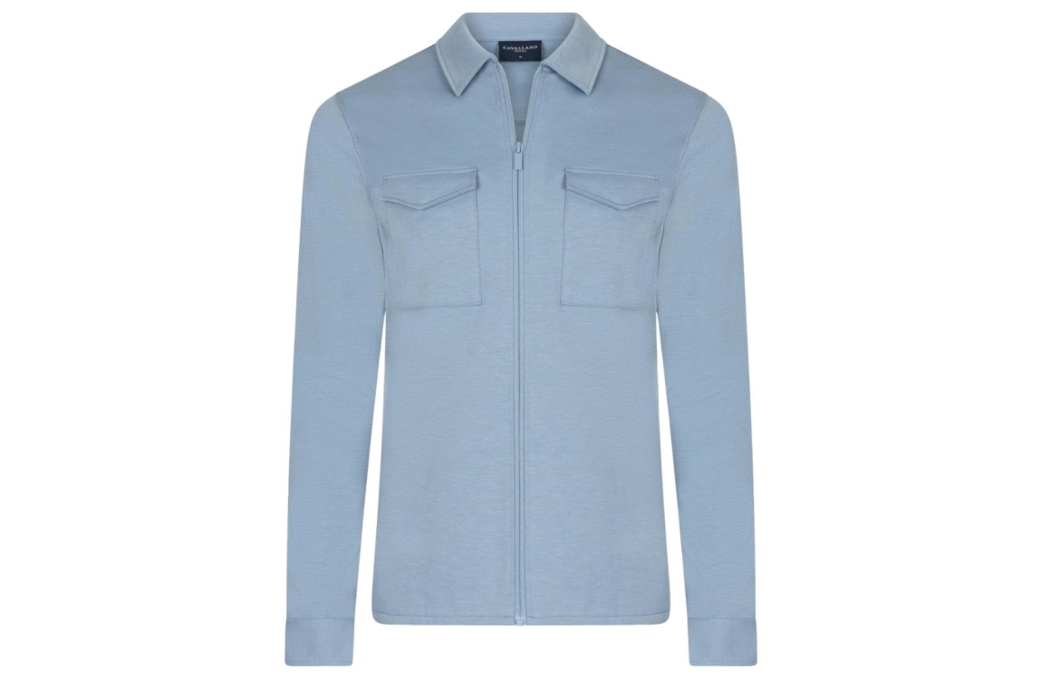 Cavallaro overshirt Zaverio 123261014. Dit rechtvallende model heeft een kraag en lange mouwen. Dit lichtblauwe overshirt van Cavallaro sluit aan de voorzijde door middel van een ritssluiting en is voorzien van twee klepzakken. Het model is op de linkermouw gedetailleerd met het merkembleem.