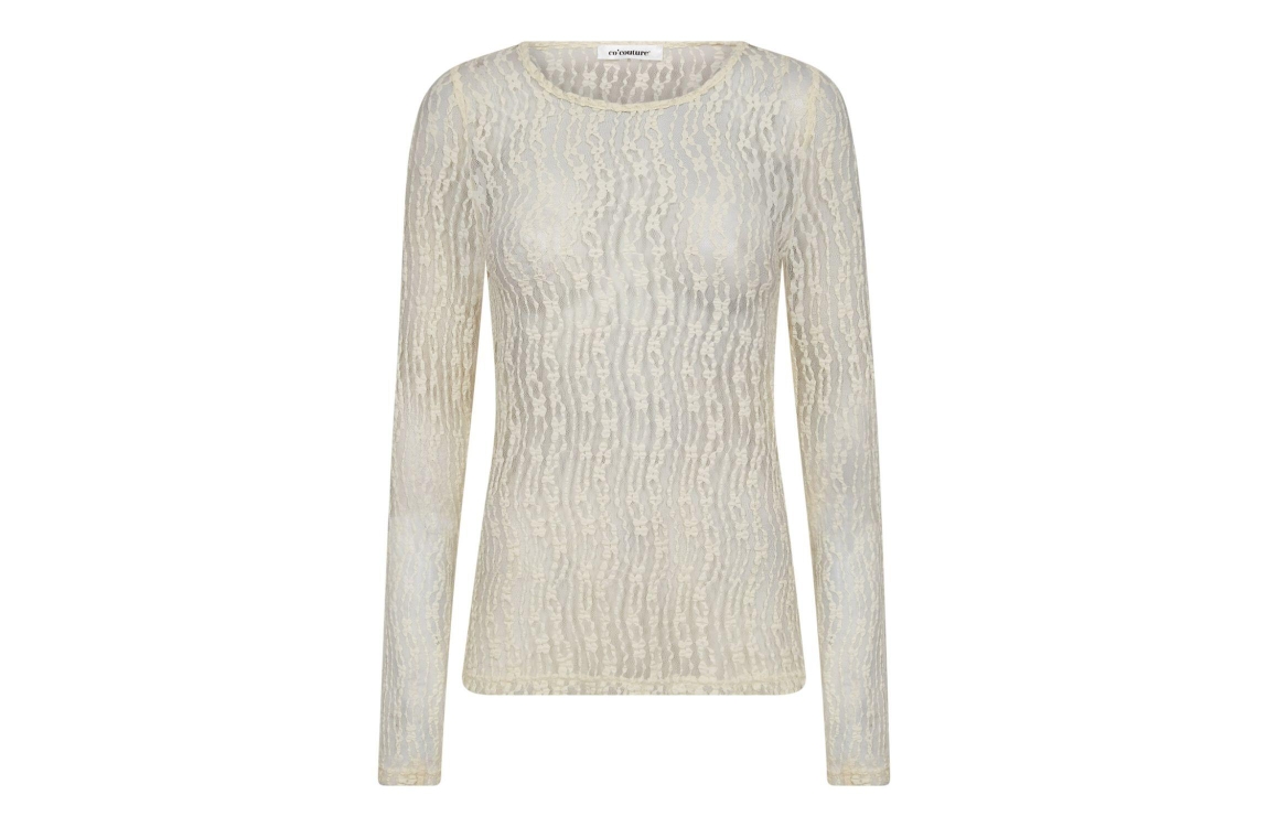 Co Couture BarbCC O-Neck Blouse Off white. Dit aangesloten model heeft een ronde hals en lange mouwen. Deze off-white top van Co Couture is uitgevoerd in een doorschijnend materiaal en bewerkt met een grafische print.