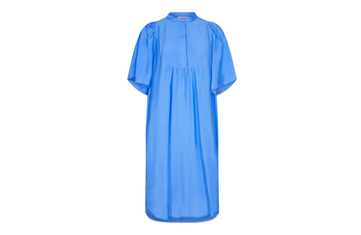 Co Couture jurk Callum. Dit wijdvallende model is voorzien van een ronde hals en heeft korte mouwen. Deze blauwe jurk van CoCouture sluit aan de bovenzijde door middel van knopen en is uitgevoerd in een glanzende kwaliteit. Deze jurk is voorzien van wijde poffende mouwen en is voorzien van twee steekzakken in de zij.