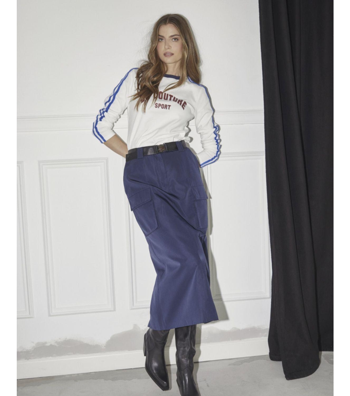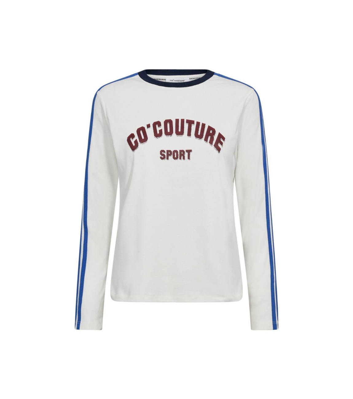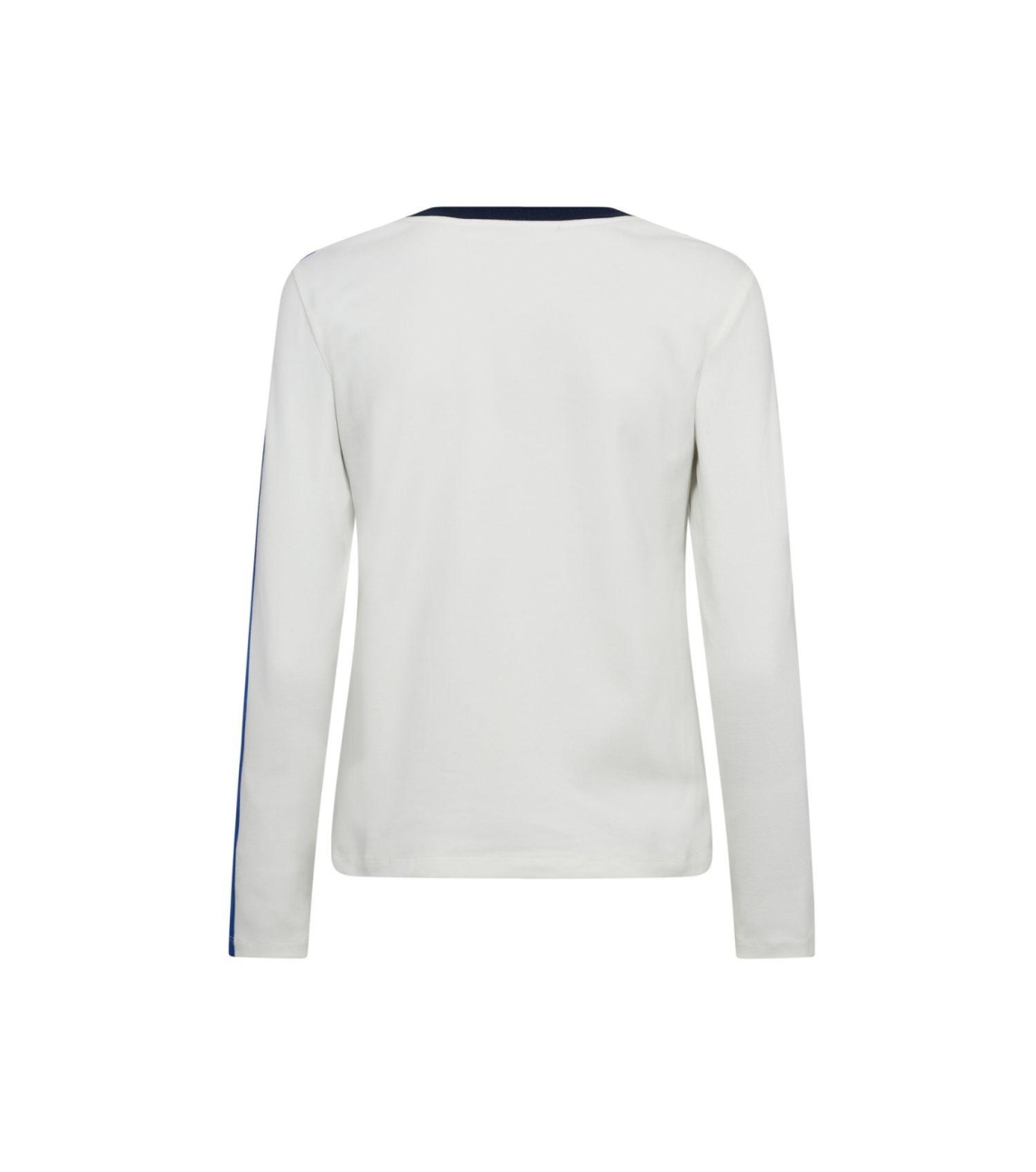 Co Couture EdgeCC sport ls tee 1117 Offwhite blue. Dit aangesloten model heeft een ronde hals en lange mouwen. Deze off white top van Co Couture is afgewerkt met blauwe strepen op de mouwen.