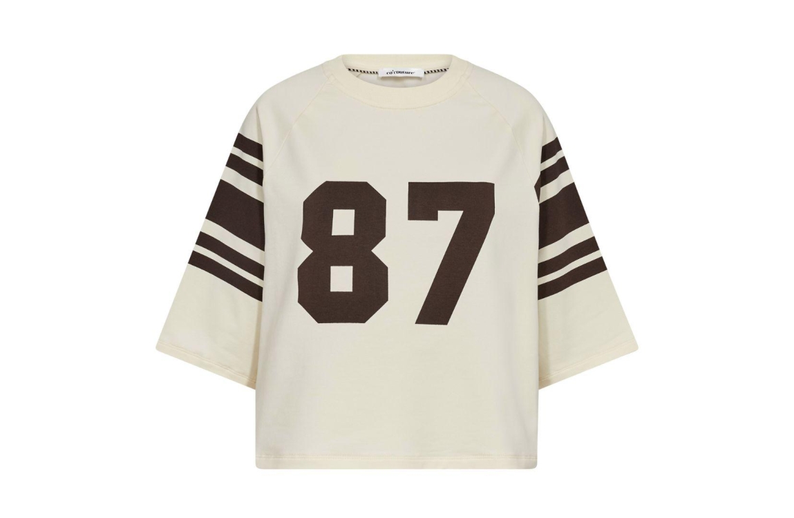 Co Couture Tee ElyCC 47012. Dit wijdvallend korte model is voorzien van een ronde hals en heeft halflange mouwen. Deze crèmekleurige sportieve T-shirt is bewerkt met bruine accenten.